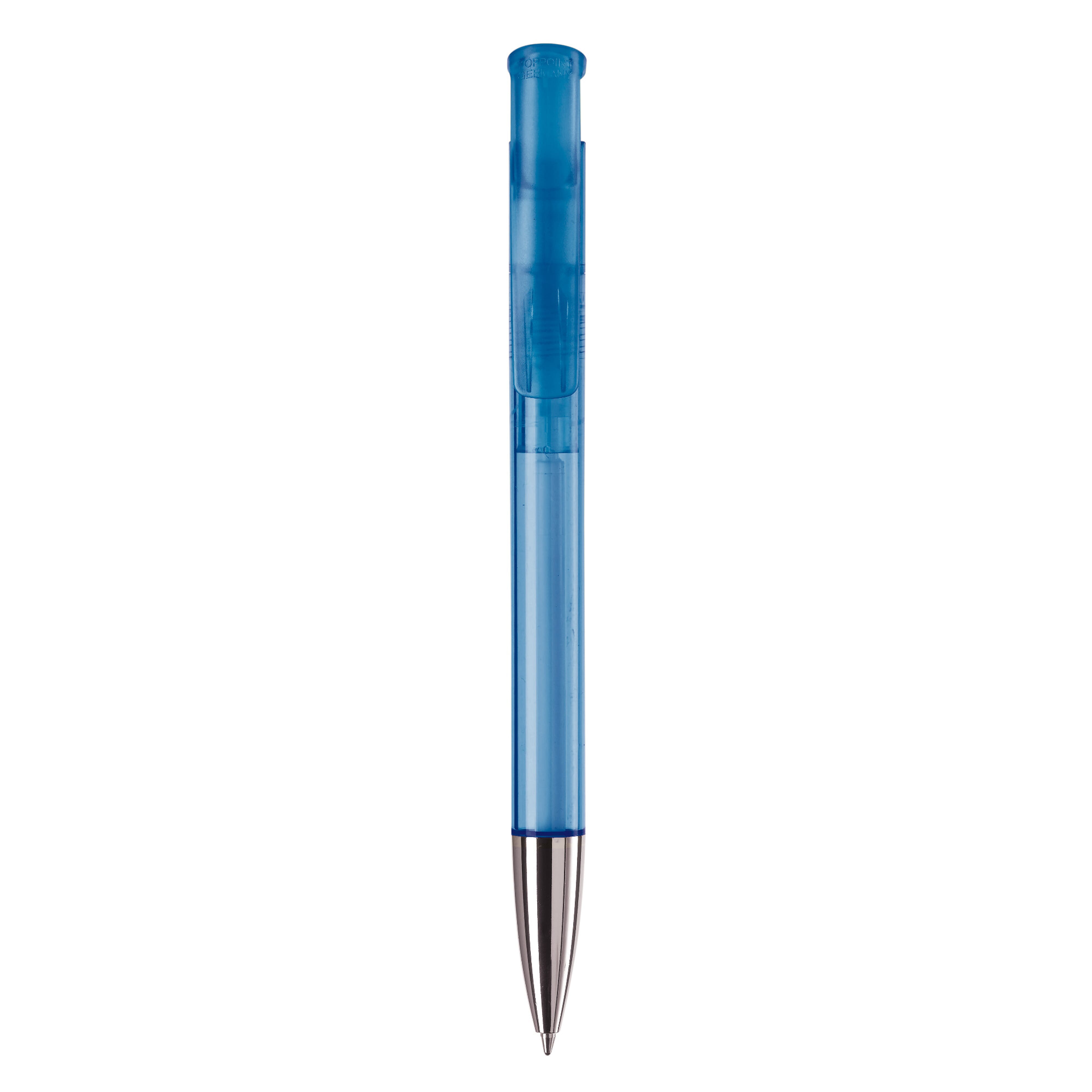 Toppoint Kugelschreiber. Mit stabilem Clip und Metallspitze. Made in Germany. Jumbo-Mine mit 4,5km Schreibleistung. Minenfarbe blau. Transparent.