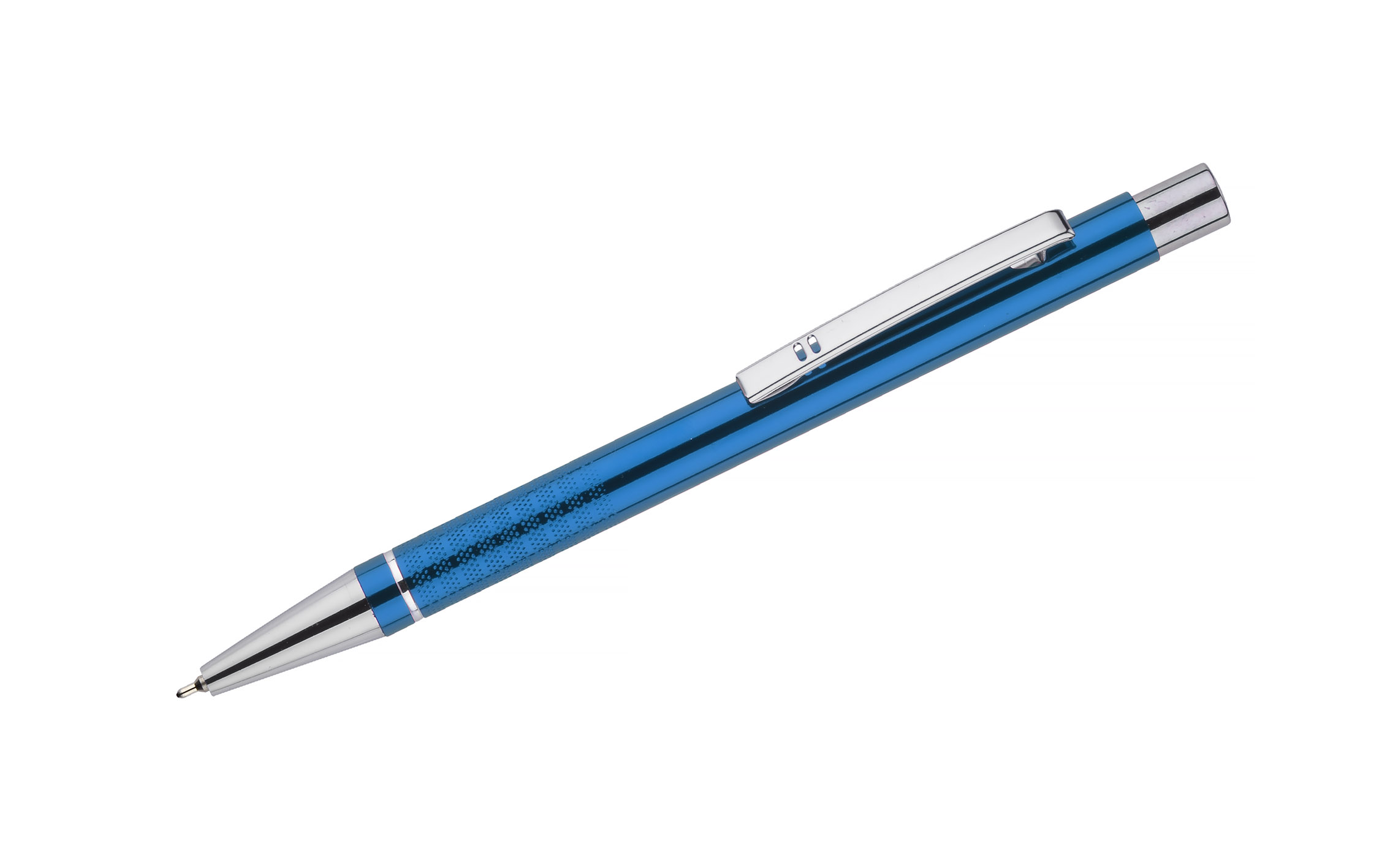 Der BONITO Kugelschreiber ist ein klassischer, eleganter Metallkugelschreiber mit verchromter Oberfläche. Hergestellt aus Aluminium. Der Schaft ist mit einem silbernen Ring an der Unterseite und Streifen mit einer leicht rauen Textur verziert. Halbgelmine mit einer Schreibdicke von 0,7 mm. Blaue Mine