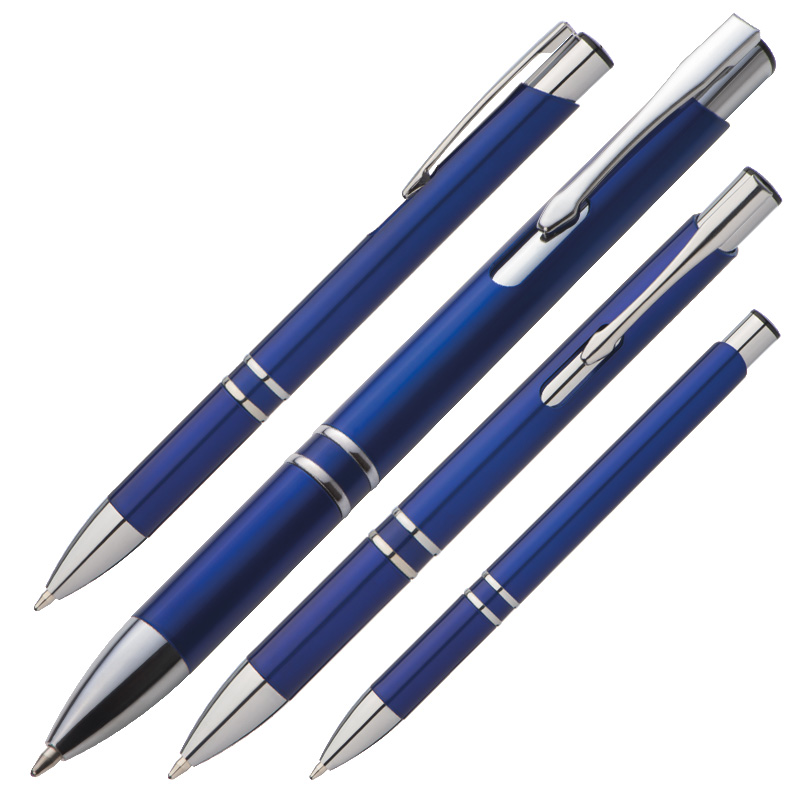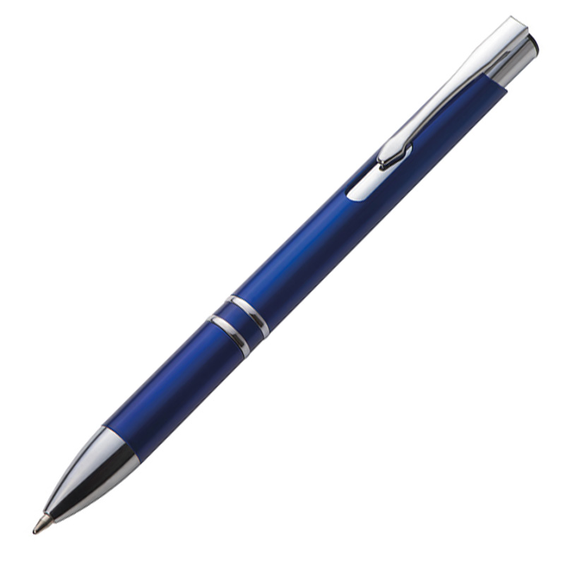 Kugelschreiber mit blauschreibender Großraummine und silbernen Applikationen. Ihre Werbung drucken wir rechts vom Clip. Wir empfehlen einen Druck in silber.