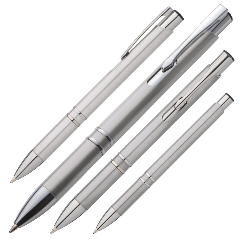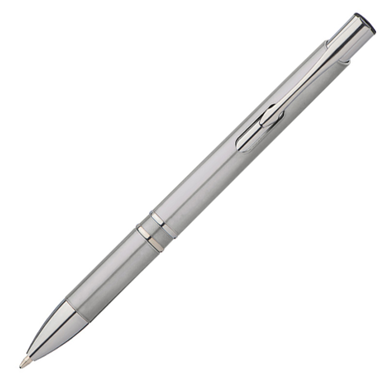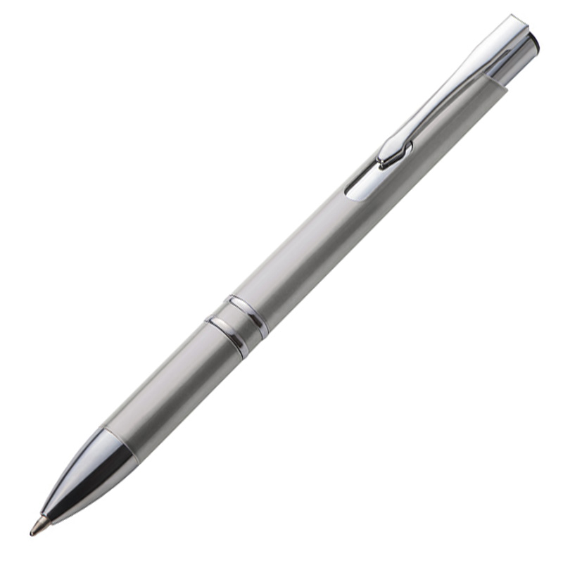 Kugelschreiber mit blauschreibender Großraummine und silbernen Applikationen. Ihre Werbung drucken wir rechts vom Clip. Wir empfehlen einen Druck in silber.