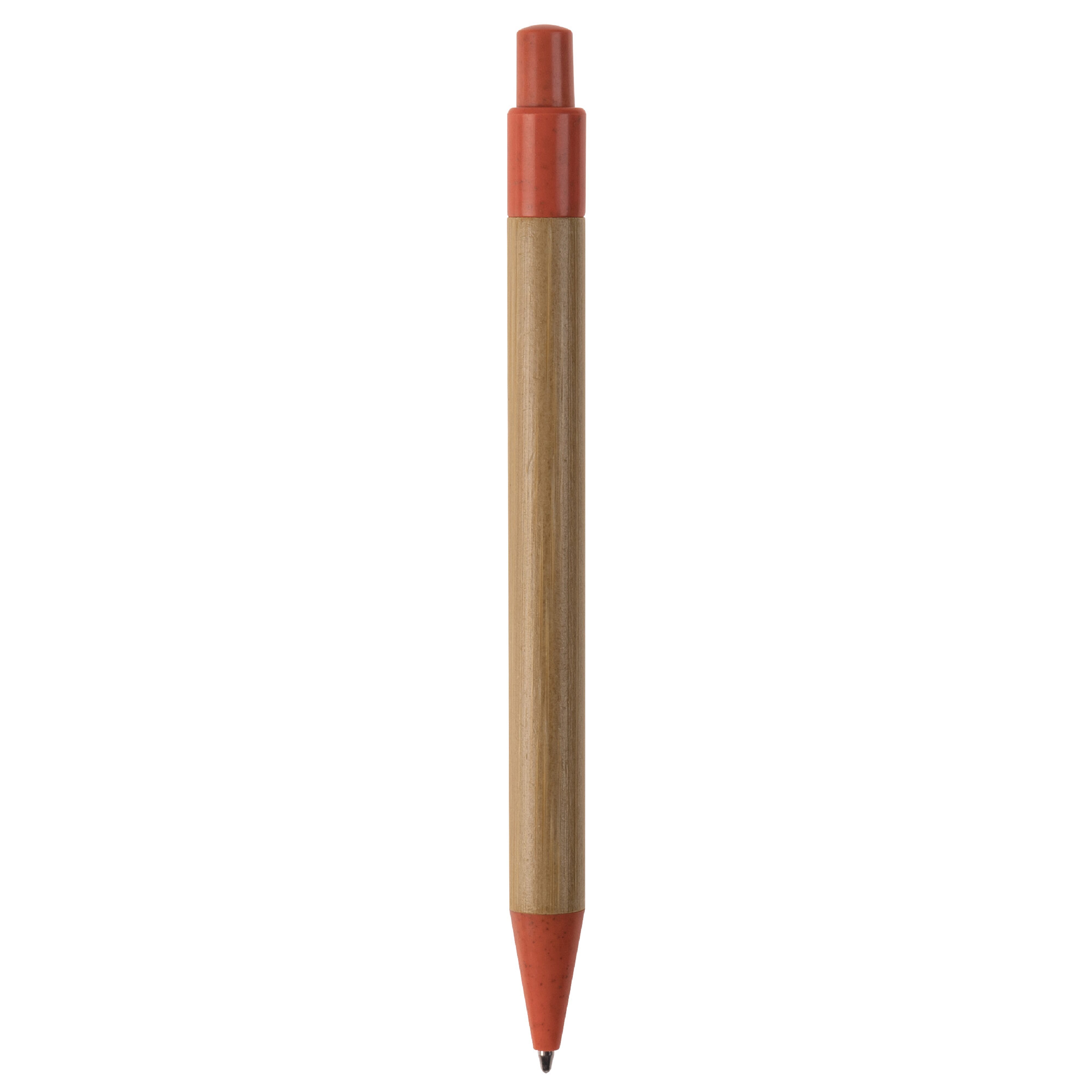 Kugelschreiber aus Bambus mit Clip, Drücker und Spitze aus Weizenstroh und einer blau schreibenden X20-Kunststoffmine.