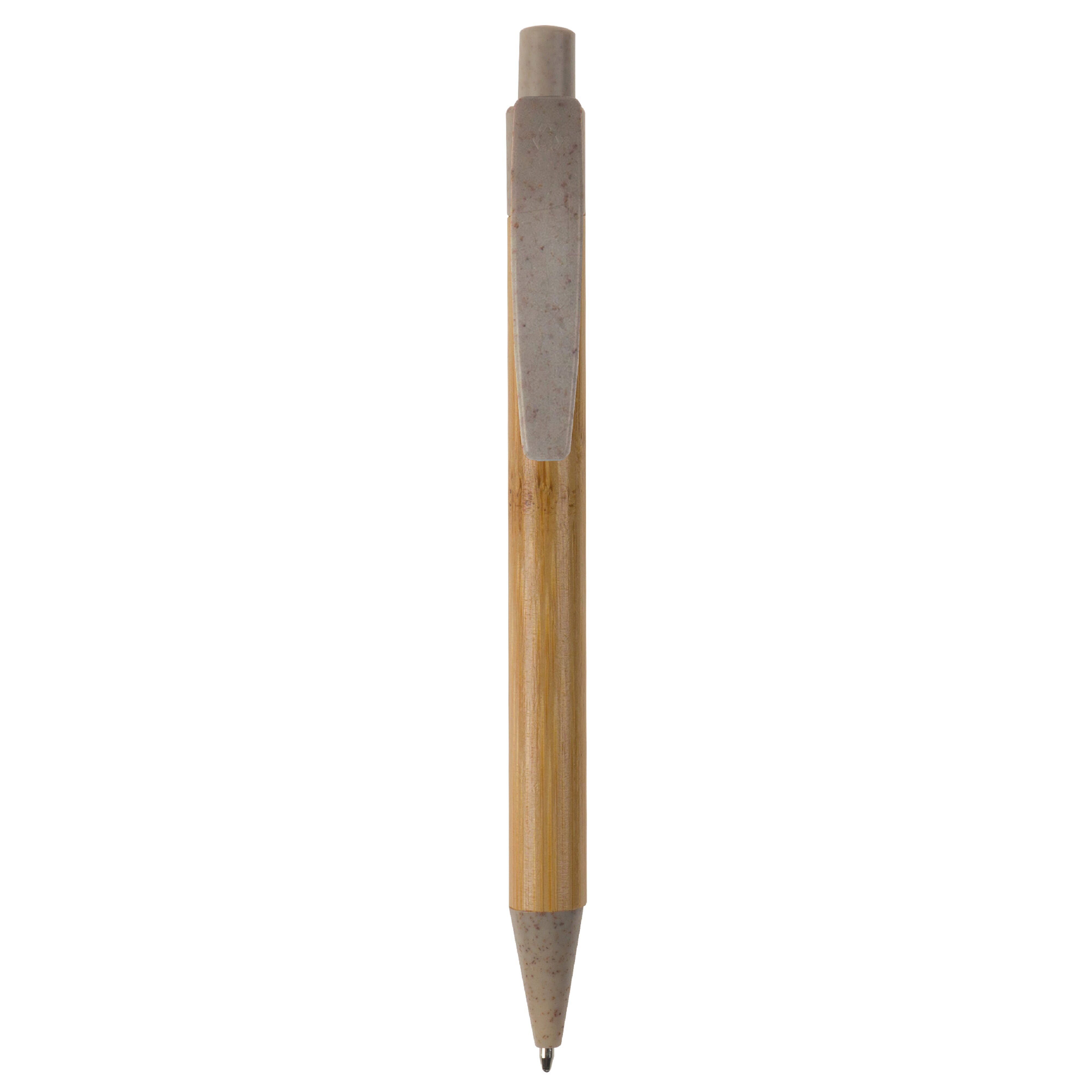 Kugelschreiber aus Bambus mit Clip, Drücker und Spitze aus Weizenstroh und einer blau schreibenden X20-Kunststoffmine.