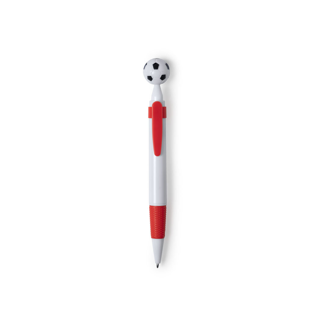 Kugelschreiber für Fußballfans, mit Detail in Form eines Balls. Push-up-Mechanismus in auffälligem, zweifarbigem Design. Korpus in weißer Farbe, mit Clip und Griff in passender Farbe und in einer breiten Palette von Farbtönen. Großer Druckbereich und blaue Tintennachfüllung.