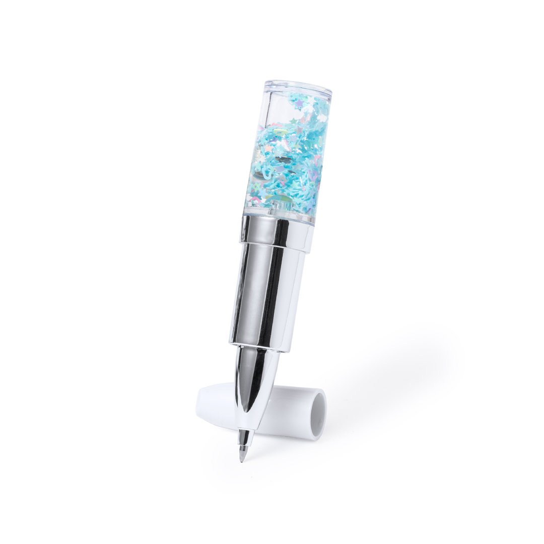 Origineller Stift in Form eines Lippenstifts, mit Flüssigkeit im Inneren in einem bunten Design. Mit Kappe und blauschreibender Tinte.