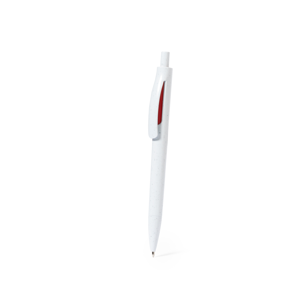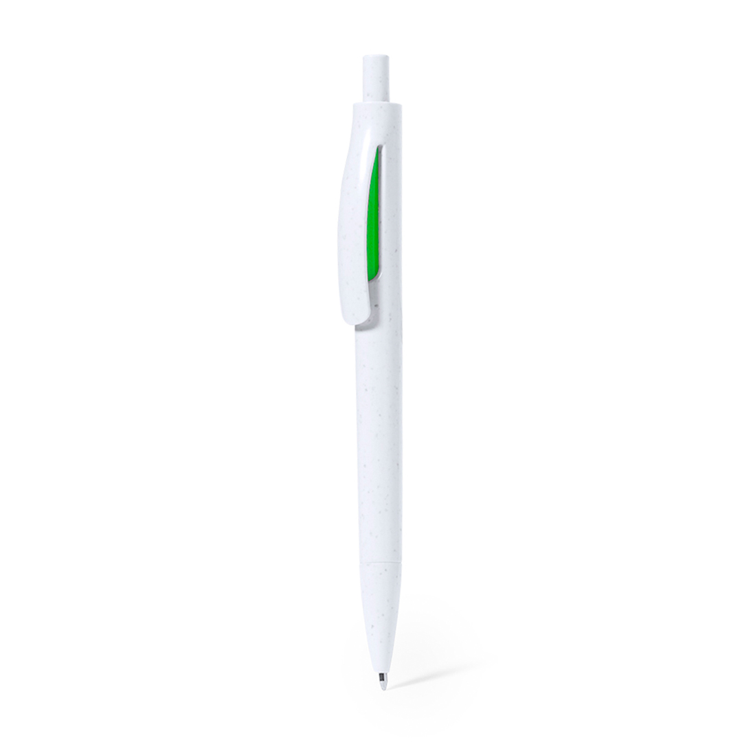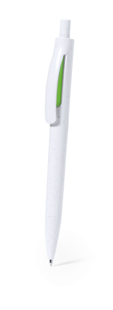 Kugelschreiber mit Druckknopfmechanismus aus recyceltem ABS. Mit farbenfrohen Beschlägen und einem glatten, weißen Schaft. Abzeichen aus recyceltem ABS auf der Oberseite des Stiftes. Mit blauer Tinte.