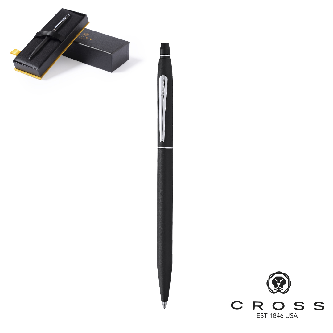 Kugelschreiber Cross Classik Click, der die ikonische Cross-Silhouette mit einem schnellen, versenkbaren Klickmechanismus und einem glatten Metallschaft kombiniert. Jumbo-Patrone in schwarzer Tinte. Präsentiert in einem eleganten, schwarzen Etui mit Markenlogo und weichem Wildlederfutter.