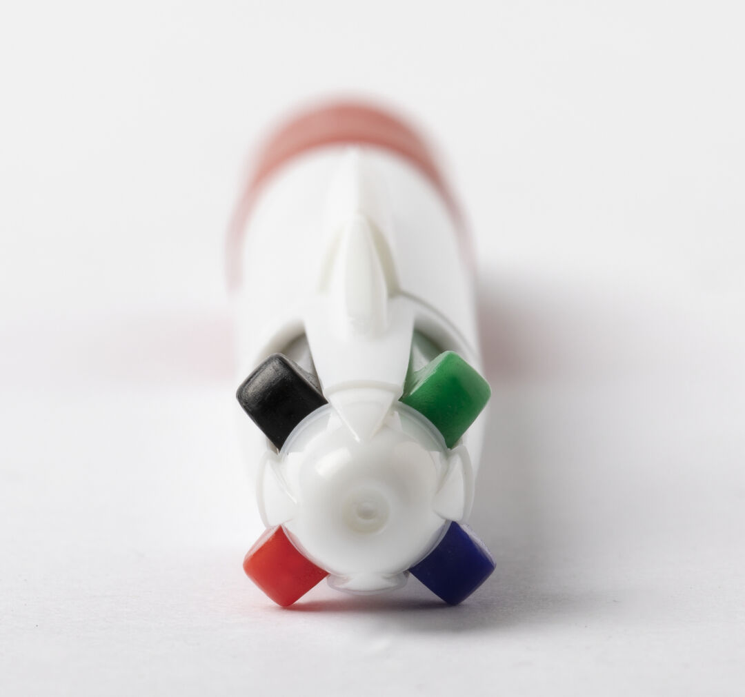 Kugelschreiber 4-in-1 mit versenkbarem Push-Up-Mechanismus, klassischem Design und einfarbigem Gehäuse in Weiß. Soft-Touch, Farbgriff in leuchtenden Tönen. 4 Patronen mit blauer, roter, schwarzer und grüner Tinte.