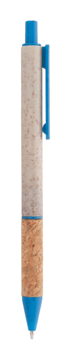 Kugelschreiber aus ökologischem Weizenstrohkunststoff mit Griffzone aus natürlichem Kork und farbigen Elementen, blauschreibend.