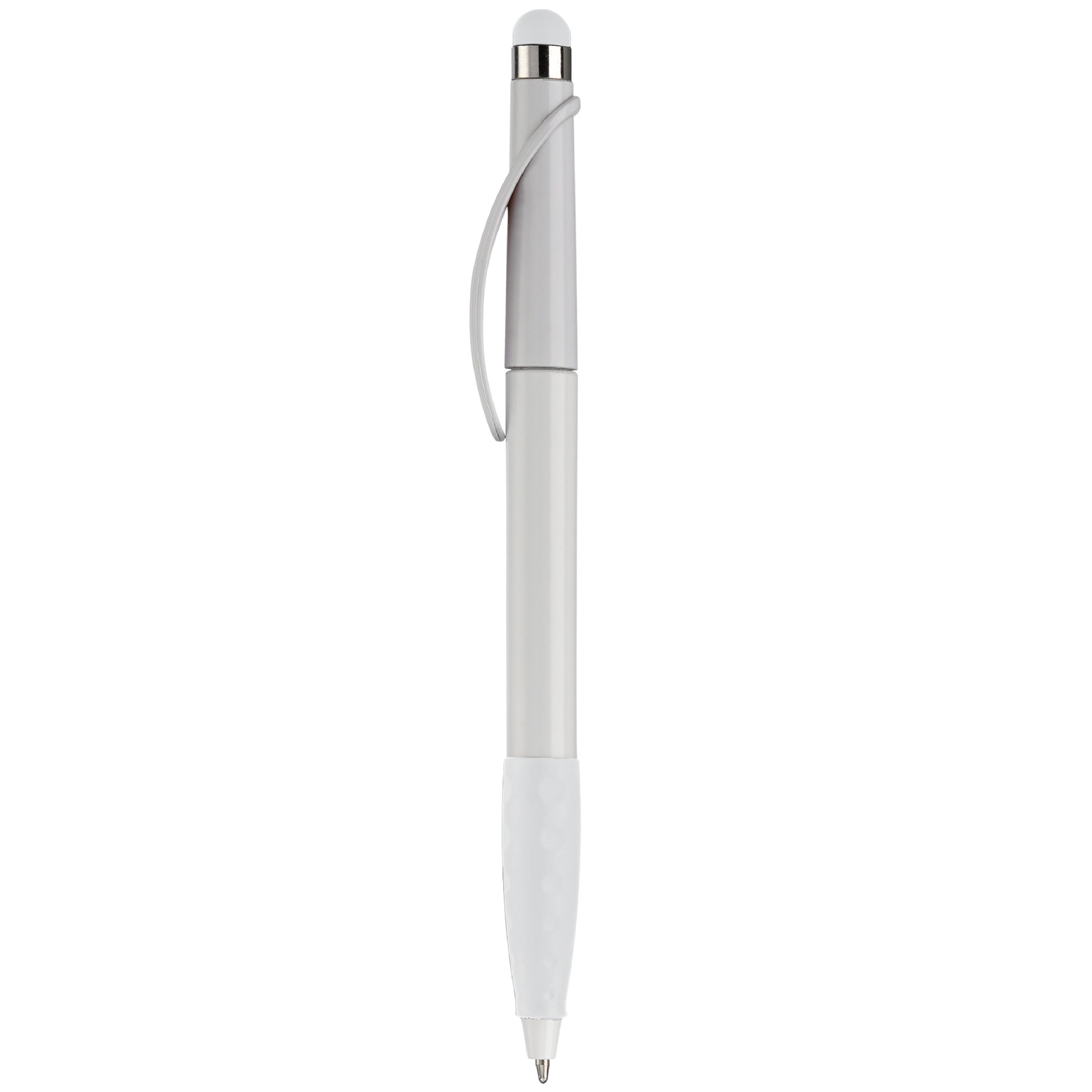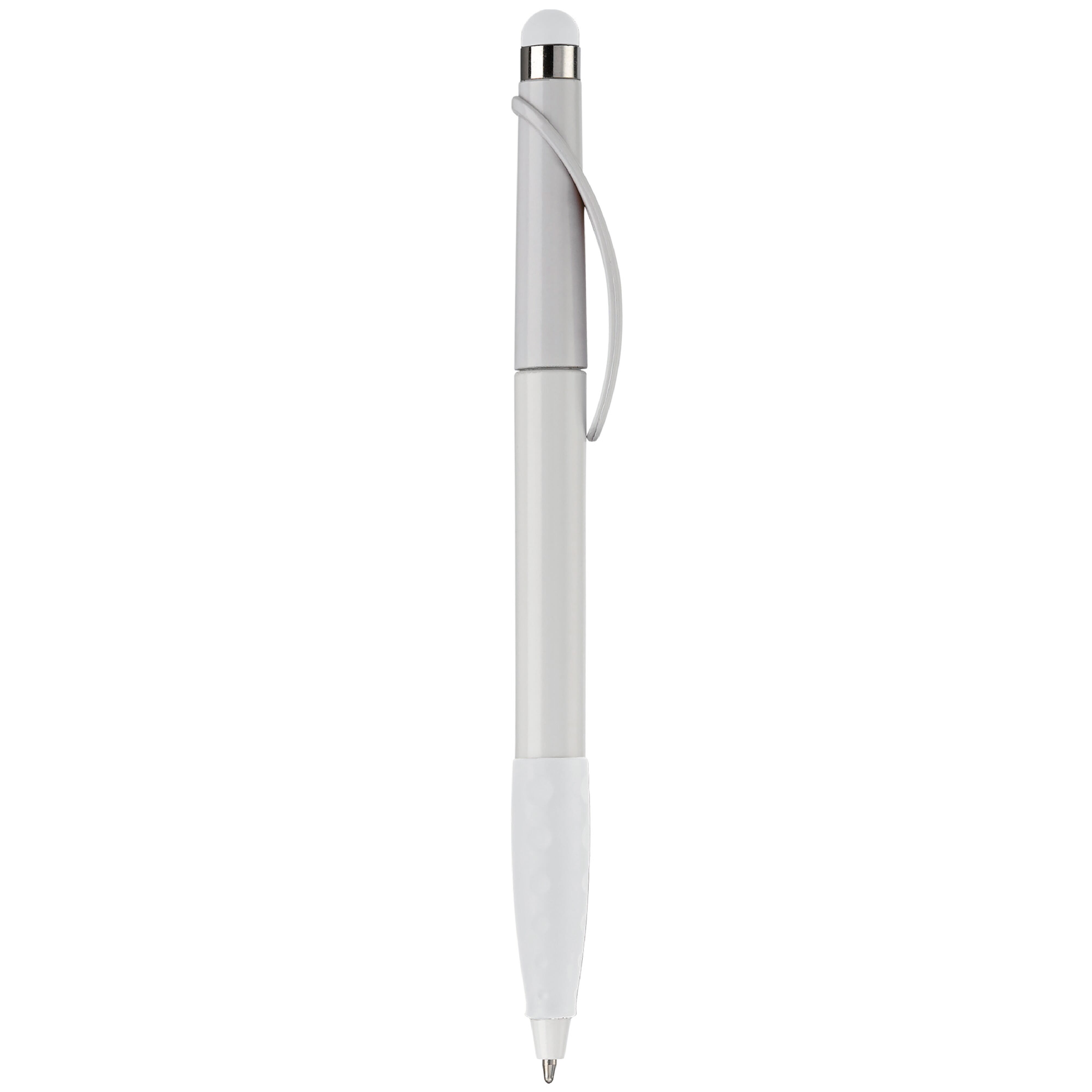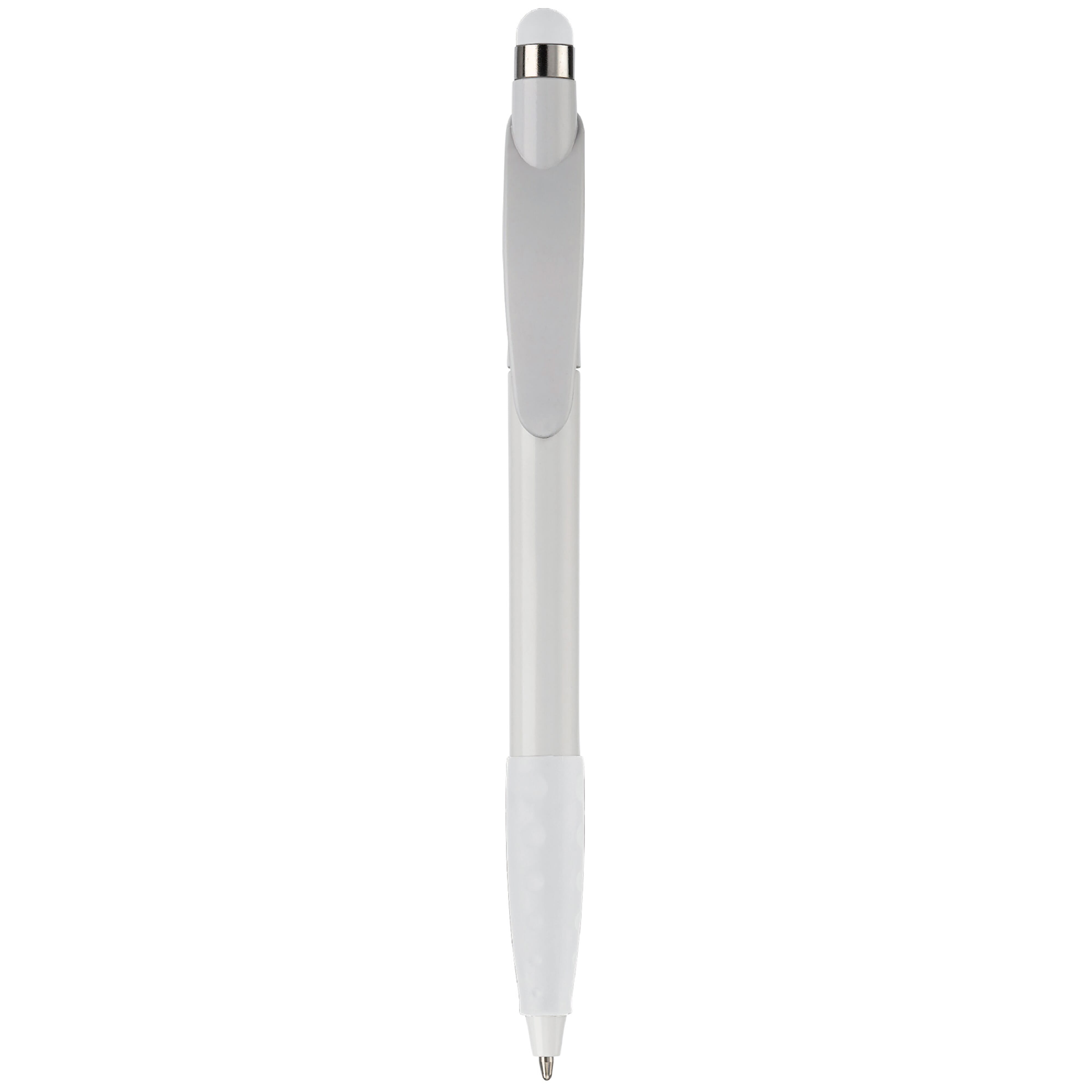 Kunststoffkugelschreiber mit Bogenclip, Gummimanschette und Stylus. Drehmechanik. Toppoint Design. Blauschreibend.