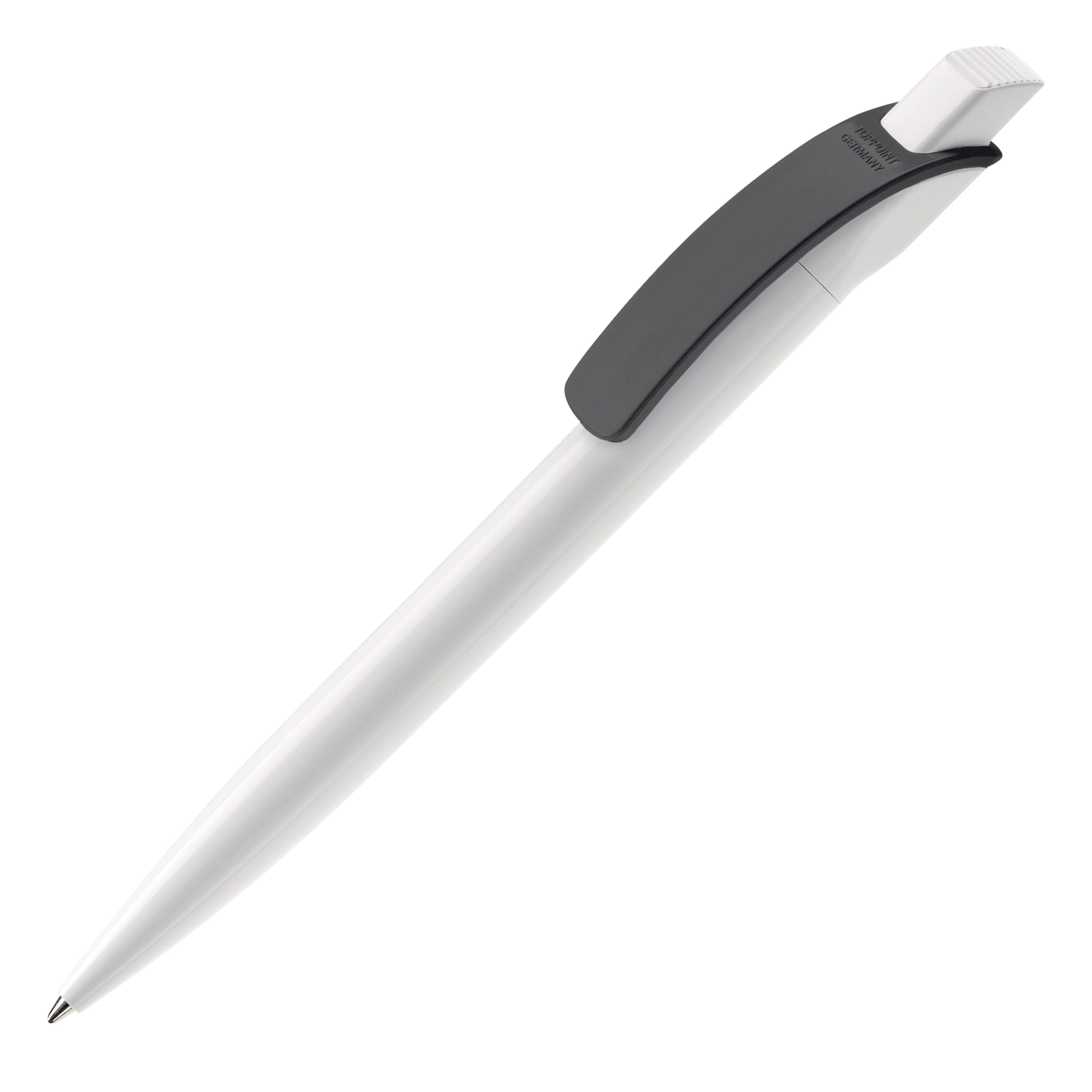 Auffallender und exklusiver Toppoint Kugelschreiber in modern schlichtem Design mit breitem Bogenclip. Das viereckige Oberteil verhindert das Wegrollen vom Tisch. Made in Germany. Mit Jumbo Kunststoffmine für 4,5km Schreibleistung. Minenfarbe blau. Hardcolour.