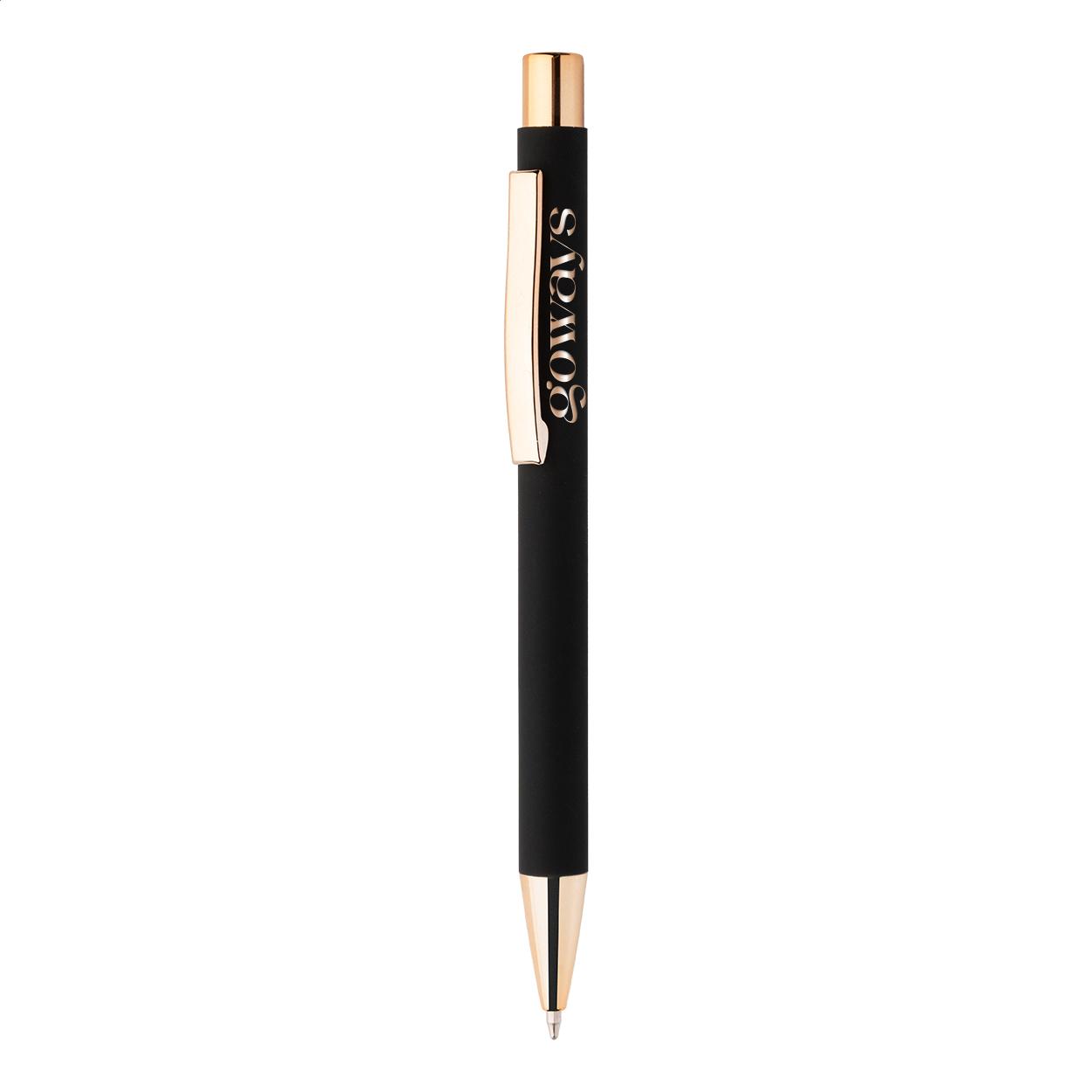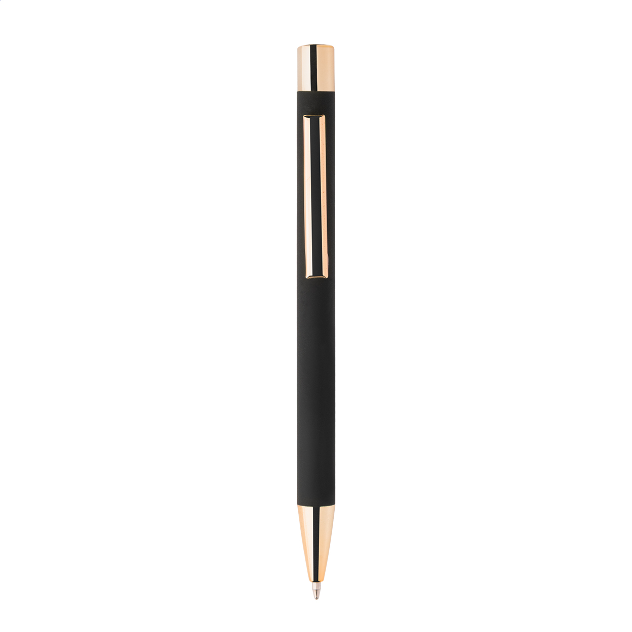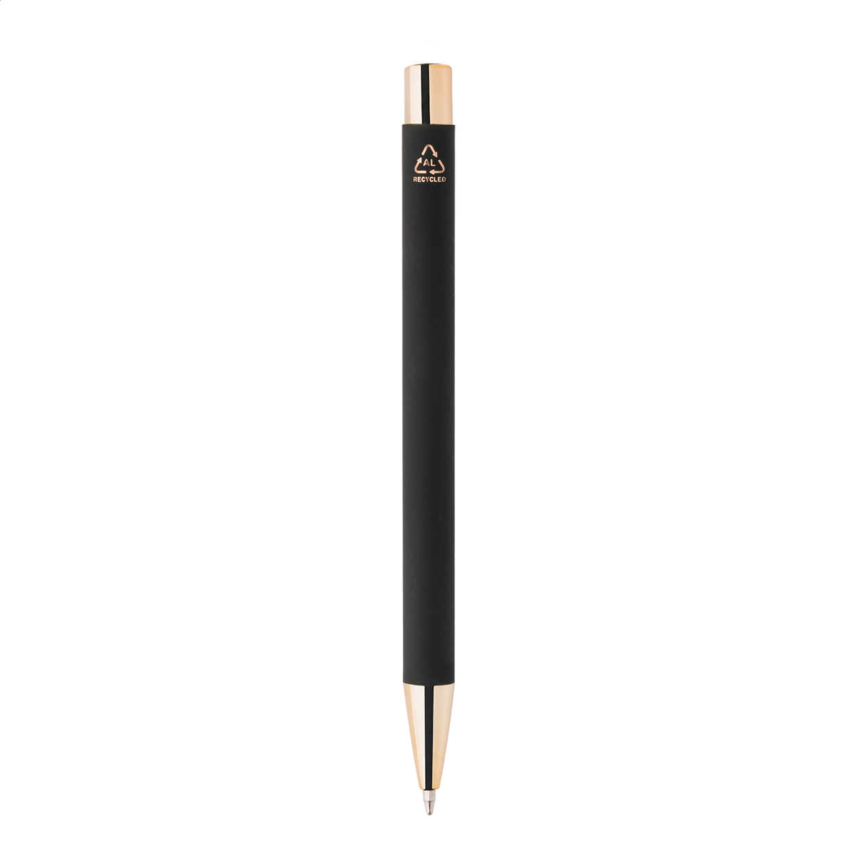Kugelschreiber aus recyceltem Aluminium mit schwarzem, gummiertem Schaft und metallic-farbigen Elementen. Mit Spezialbeschichtung für eine farbige Spiegelgravur (Gravurfarbe abgestimmt mit farbigen Elementen). Blauschreibend.