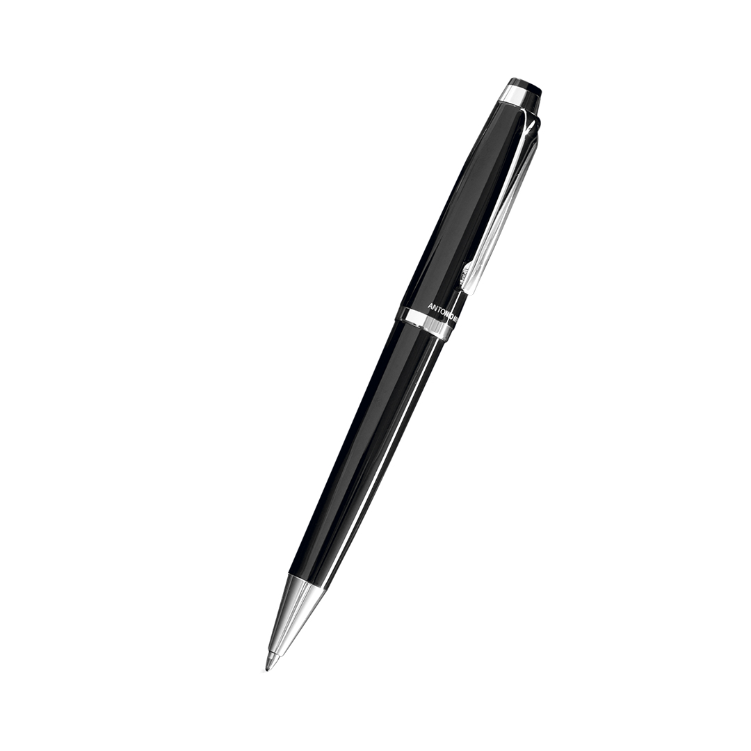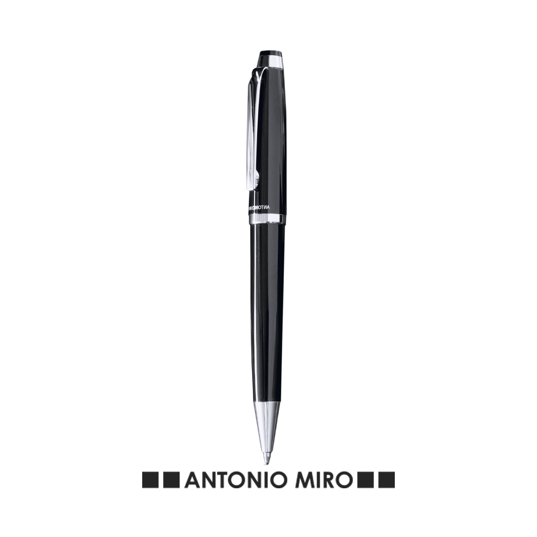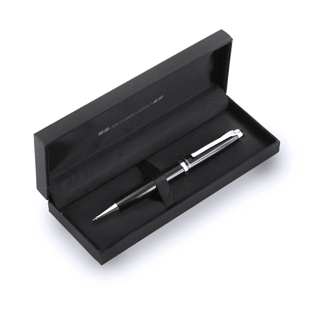 Kugelschreiber von Antonio Miró mit elegantem, zweifarbigem Design und geschmeidigem Metallschaft in schlichtem Schwarz. Mit dem Markenlogo auf dem Ring, sowie Clip und Spitze in glänzendem Silber. Präsentiert in einer individuellen Schachtel in Schwarz mit dem Markenlogo. Jumbo-Patrone mit blauer Tinte.