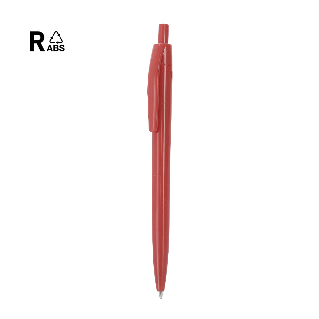 Kugelschreiber aus RABS. Druckmechanismus und blauer Tinte. RABS-Merkmal auf der Oberseite des Kugelschreibers. RABS ist ein hochgradig recycelbarer Kunststoff mit hoher Widerstandsfähigkeit und zahlreichen Anwendungen die ihn zu einer umweltfreundlichen Lösung machen.