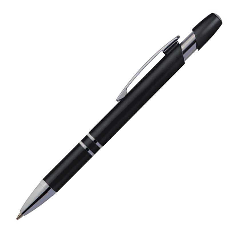 Kugelschreiber im schicken Metalliclook mit blauschreibender Mine. Ihre Werbung drucken wir rechts vom Clip.