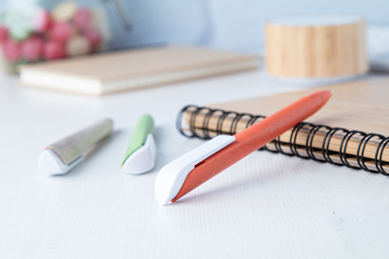 Ükologischer Kugelschreiber aus Weizenstroh-Kunststoff mit weißem Clip, blauschreibend.