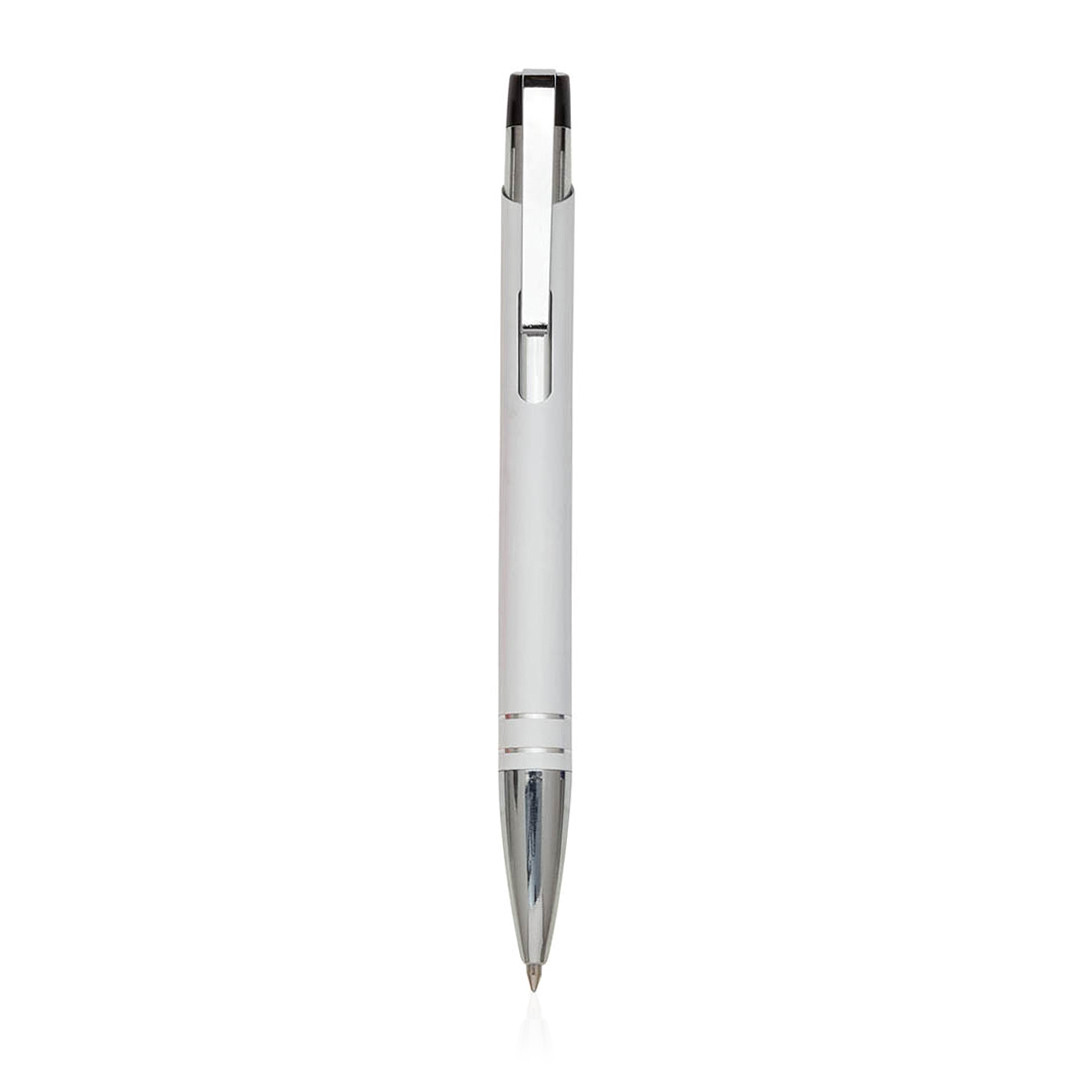 Origineller Druck-Kugelschreiber mit elegantem, zweifarbigem Design. Mit Aluminiumkörper mit Stanzung und glattem Finish in verschiedenen Farben. Gebogener Clip, Ringe und Spitze in Silber. Jumbo-Patrone mit blauer Tinte.
