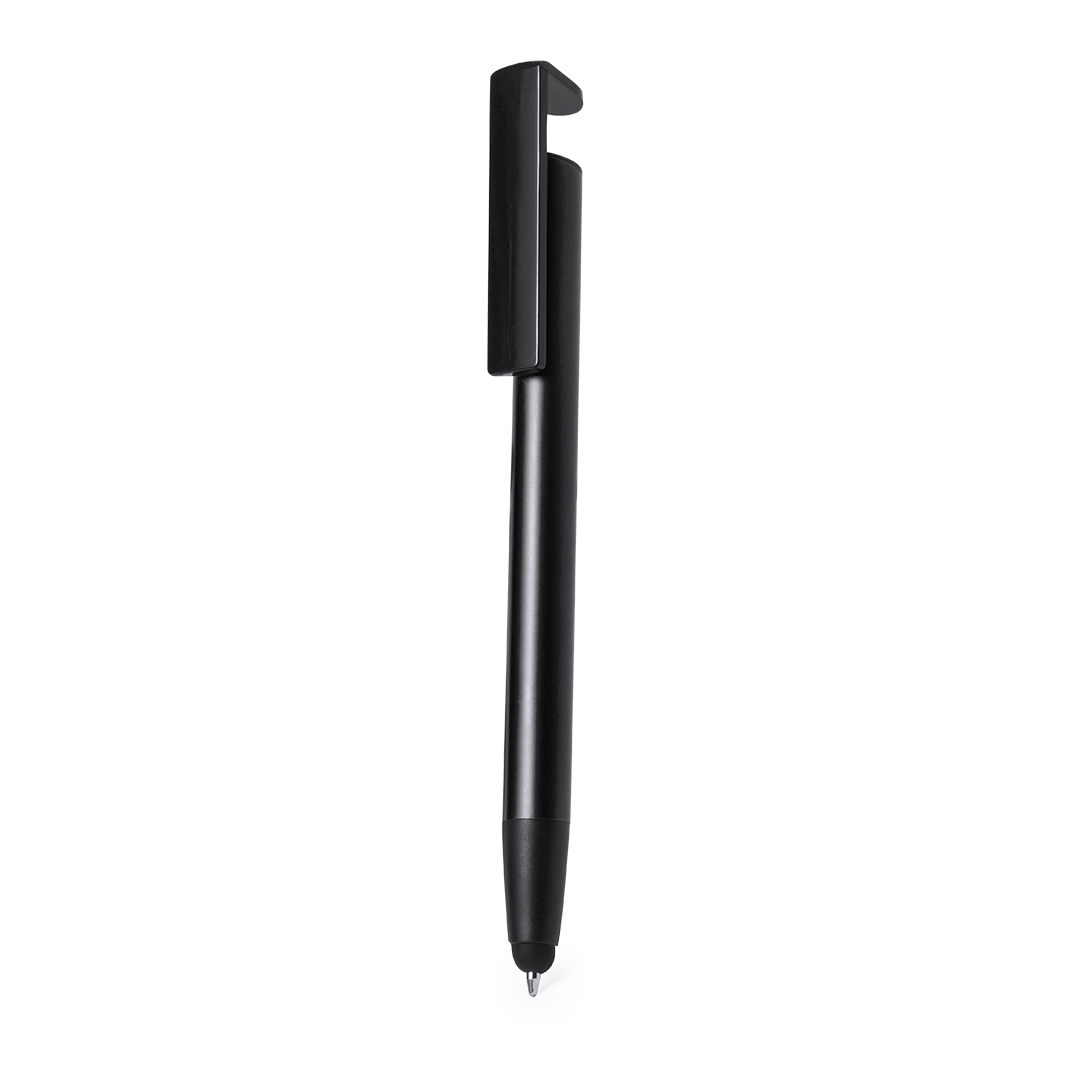 Kugelschreiber mit Druckknopfmechanik, hergestellt aus langlebigem Aluminium. Mit integriertem Handyhalter im Clip und glattem Schaft in verschiedenen Metallfarben. Mit blauer Tinte und einzeln verpackt in einer recycelten Tasche.