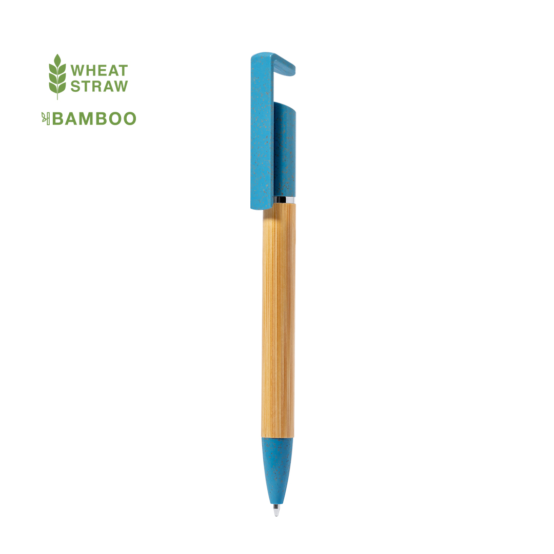 Praktischer Kugelschreiber mit Halter aus Bambus und Weizenstroh. Bambusfass mit farbigem Weizenstroh-Zubehör und dekorativen Elementen aus Metall. Drehmechanismus, mit integrierter Cliphalterung für Mobilgeräte. Mit blauer Tinte, mit Jumbo-Mine und in verschiedenen Farben erhältlich. Materialien wie Bambus fördern die Nutzung natürlicher Rohstoffe und reduzieren so den Schadstoffausstoß. Es stammt von einer äußerst widerstandsfähigen und vielseitigen Pflanze mit schnellem Wachstum und Regeneration, was es zu einer hervorragenden Alternative zur Verwendung von herkömmlichem Holz macht.