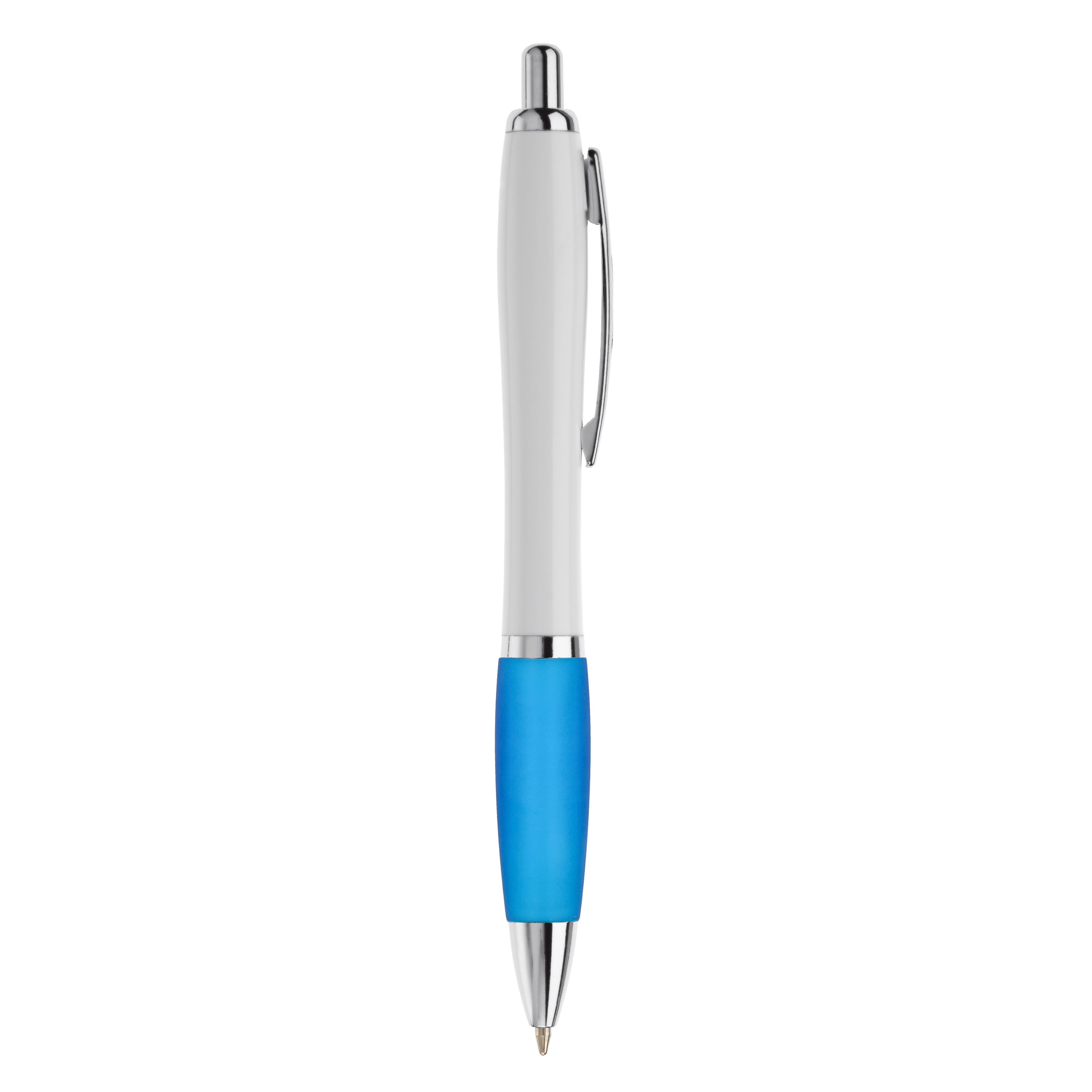 Weißer Kugelschreiber mit Metallclip, metallisierter Drücker, Ring und Spitze. Blauschreibende Jumbo-Mine.