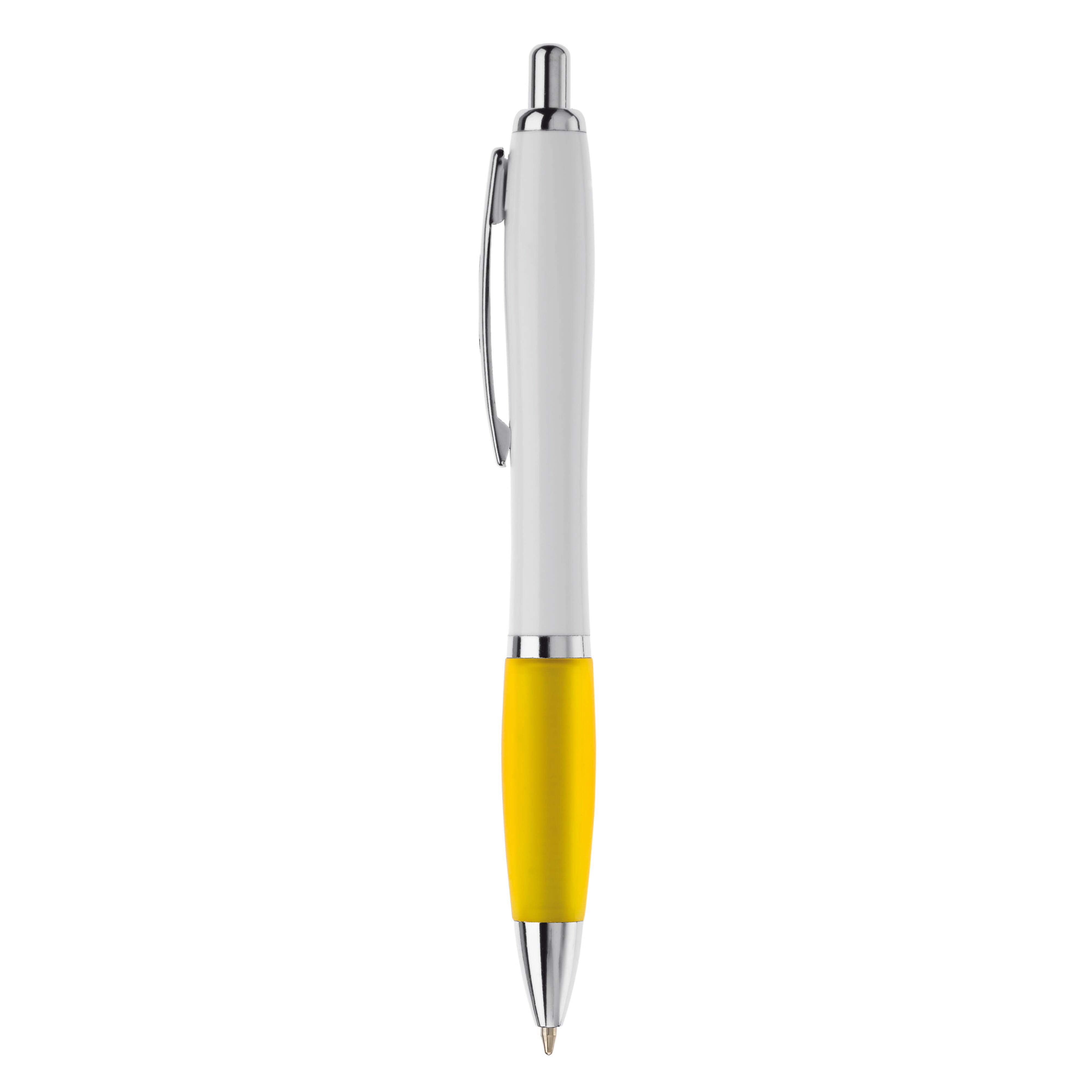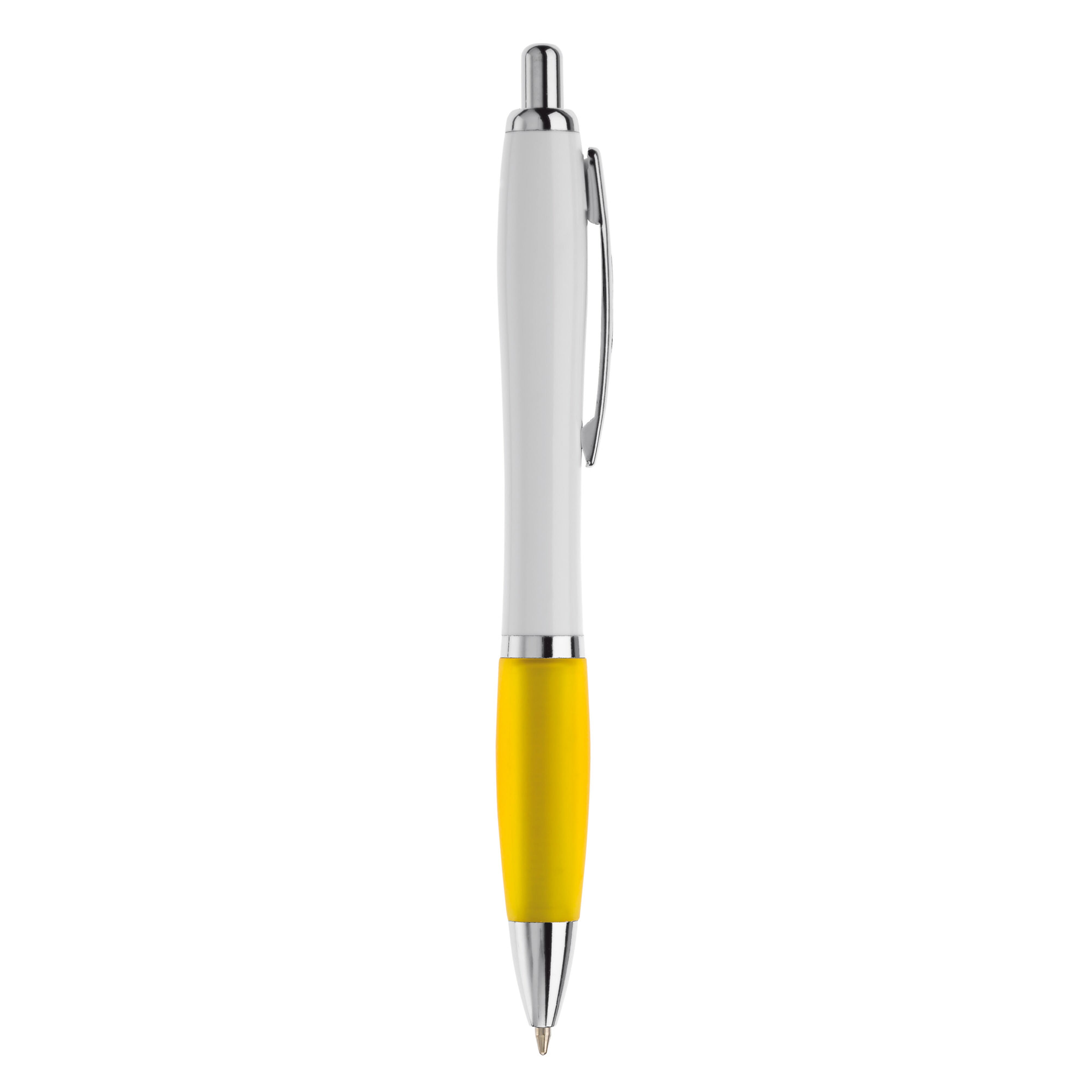 Weißer Kugelschreiber mit Metallclip, metallisierter Drücker, Ring und Spitze. Blauschreibende Jumbo-Mine.