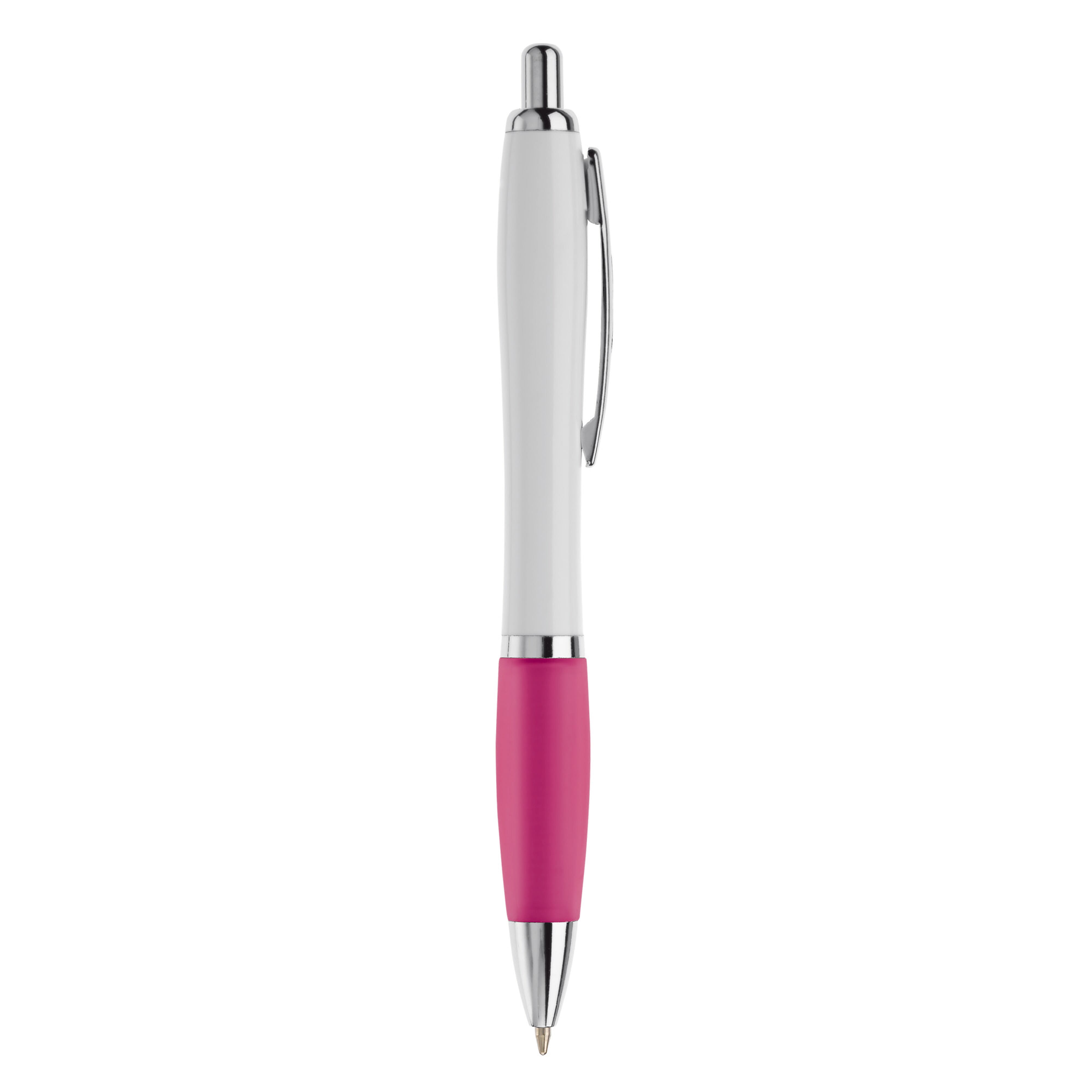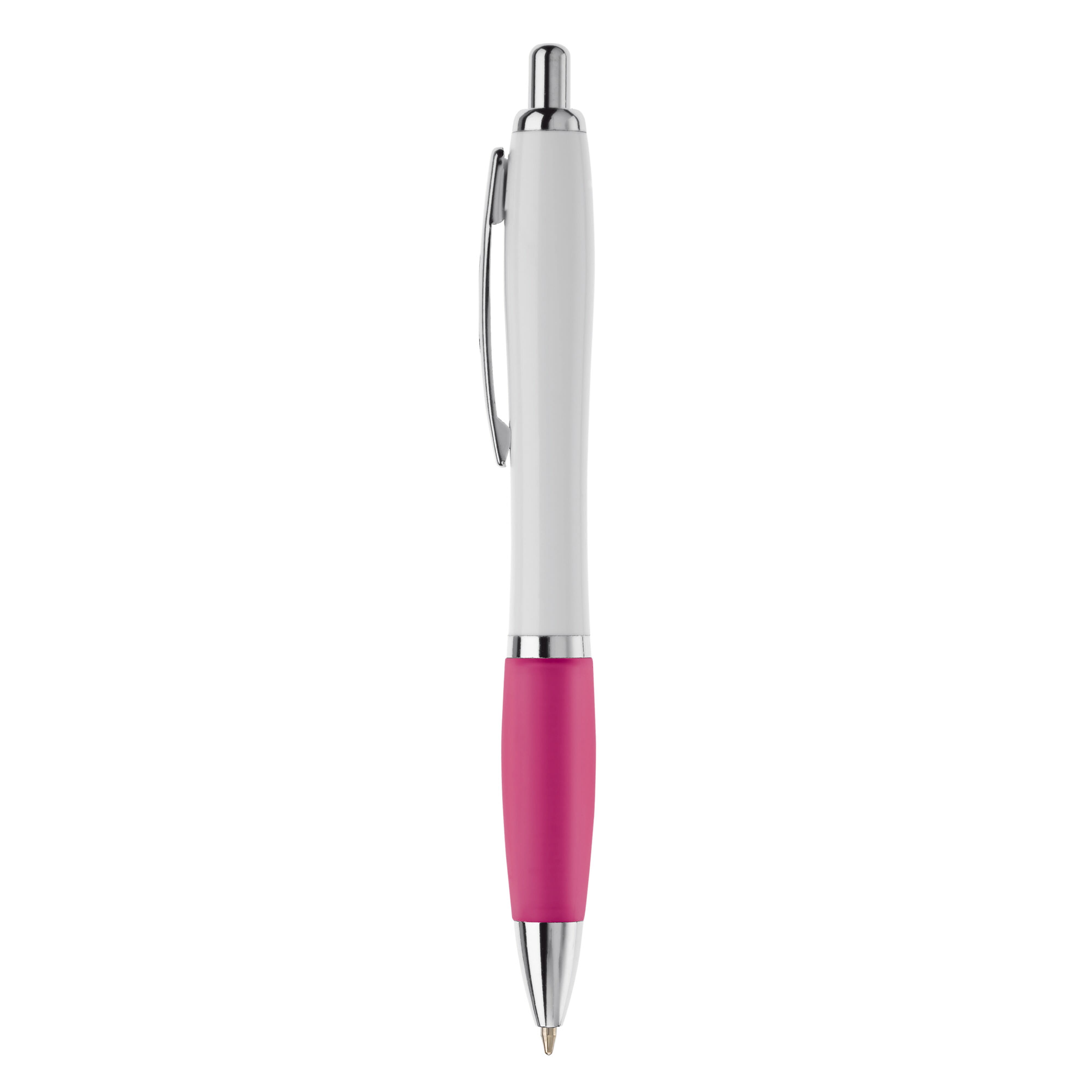 Weißer Kugelschreiber mit Metallclip, metallisierter Drücker, Ring und Spitze. Blauschreibende Jumbo-Mine.