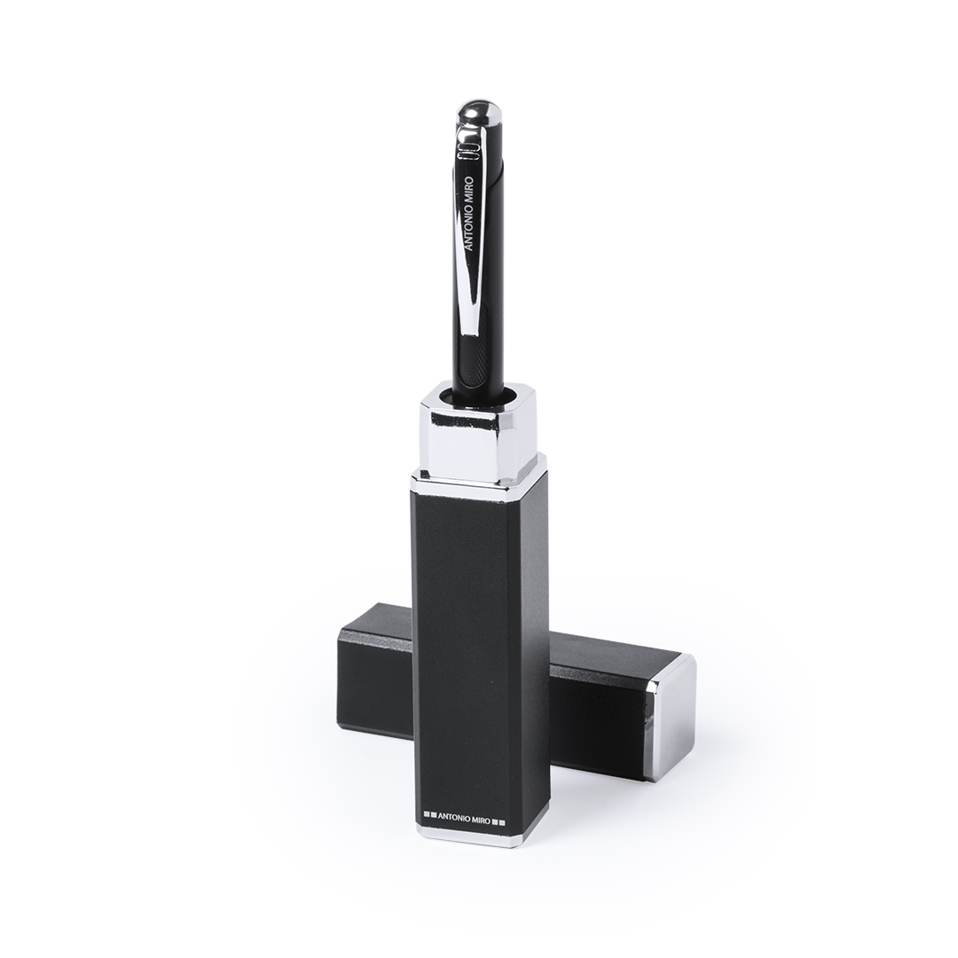 Druck-Kugelschreiber von Antonio Miró mit elegantem Design und geschmeidigem Aluminiumschaft mit silbernen Kontrastdetails. Mit originellem Metallclip und oberem Ende sowie Stanzung aus Karbon. Präsentiert in einem individuellen Aluminium-Case in Schwarz mit dem Markenlogo. Blaue Tinte.