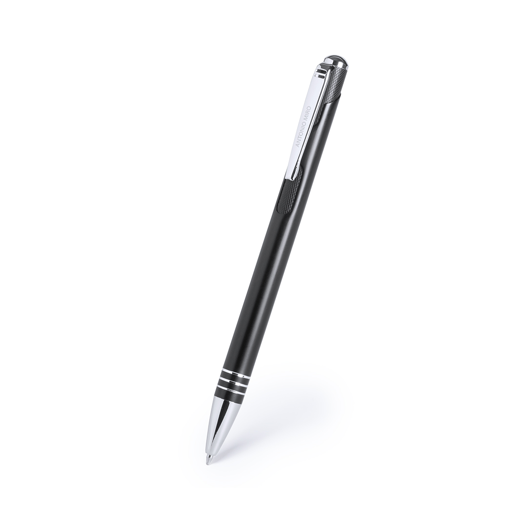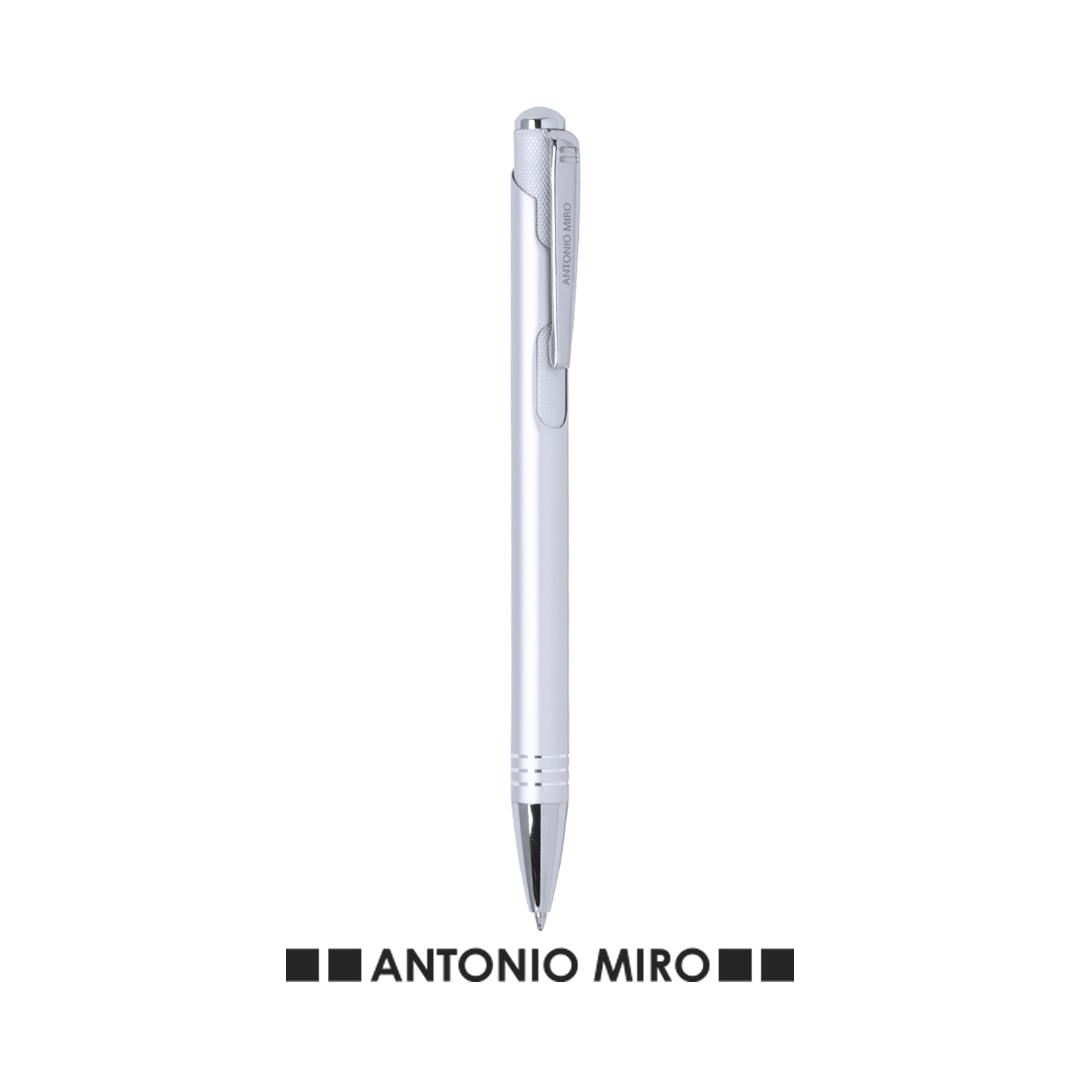 Druck-Kugelschreiber von Antonio Miró mit elegantem Design und geschmeidigem Aluminiumschaft mit silbernen Kontrastdetails. Mit originellem Metallclip und oberem Ende sowie Stanzung aus Karbon. Präsentiert in einem individuellen Aluminium-Case in Schwarz mit dem Markenlogo. Blaue Tinte.