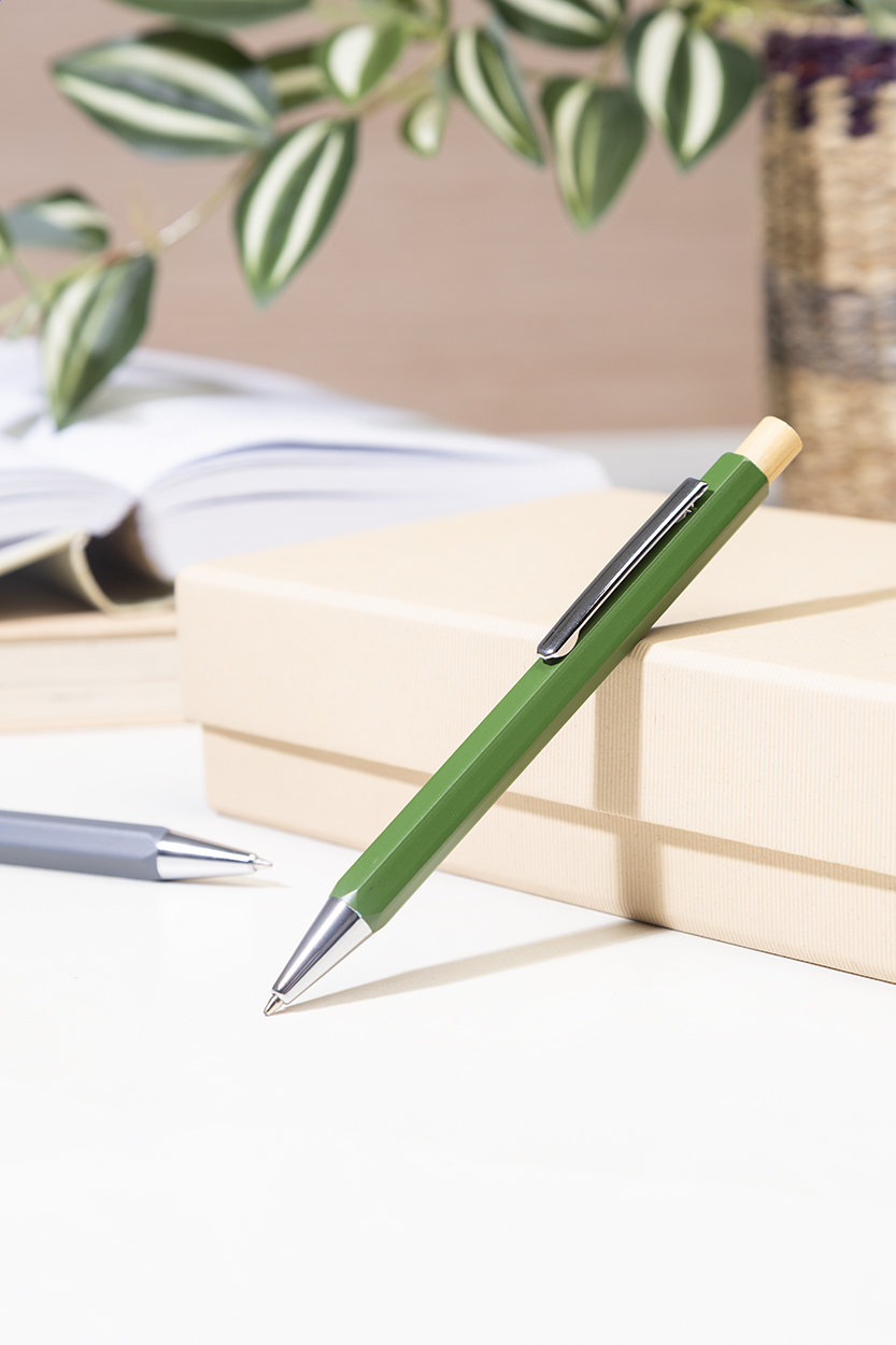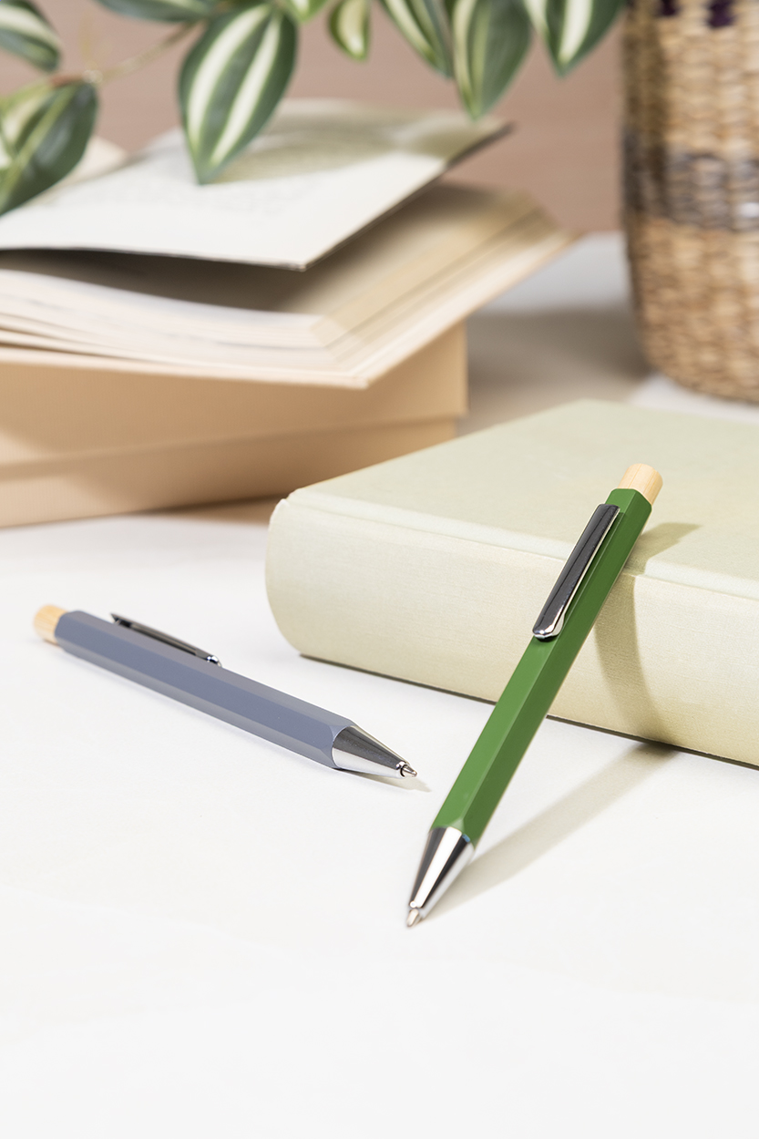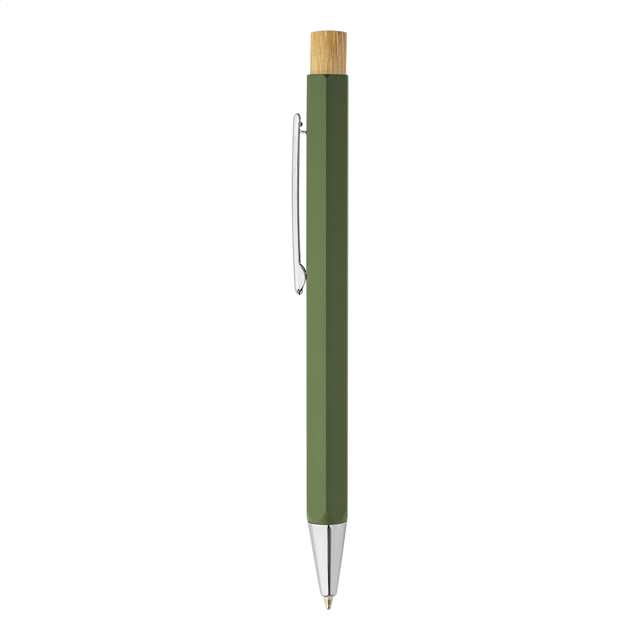 Sechseckiger Kugelschreiber aus recyceltem Aluminium mit Drücker aus Bambus und verchromten Elementen. Blauschreibend.