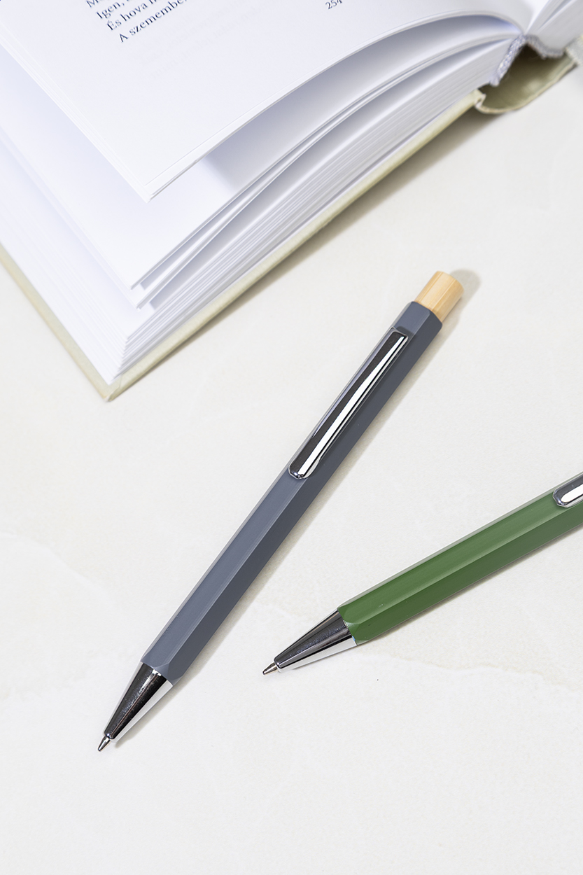 Sechseckiger Kugelschreiber aus recyceltem Aluminium mit Drücker aus Bambus und verchromten Elementen. Blauschreibend.