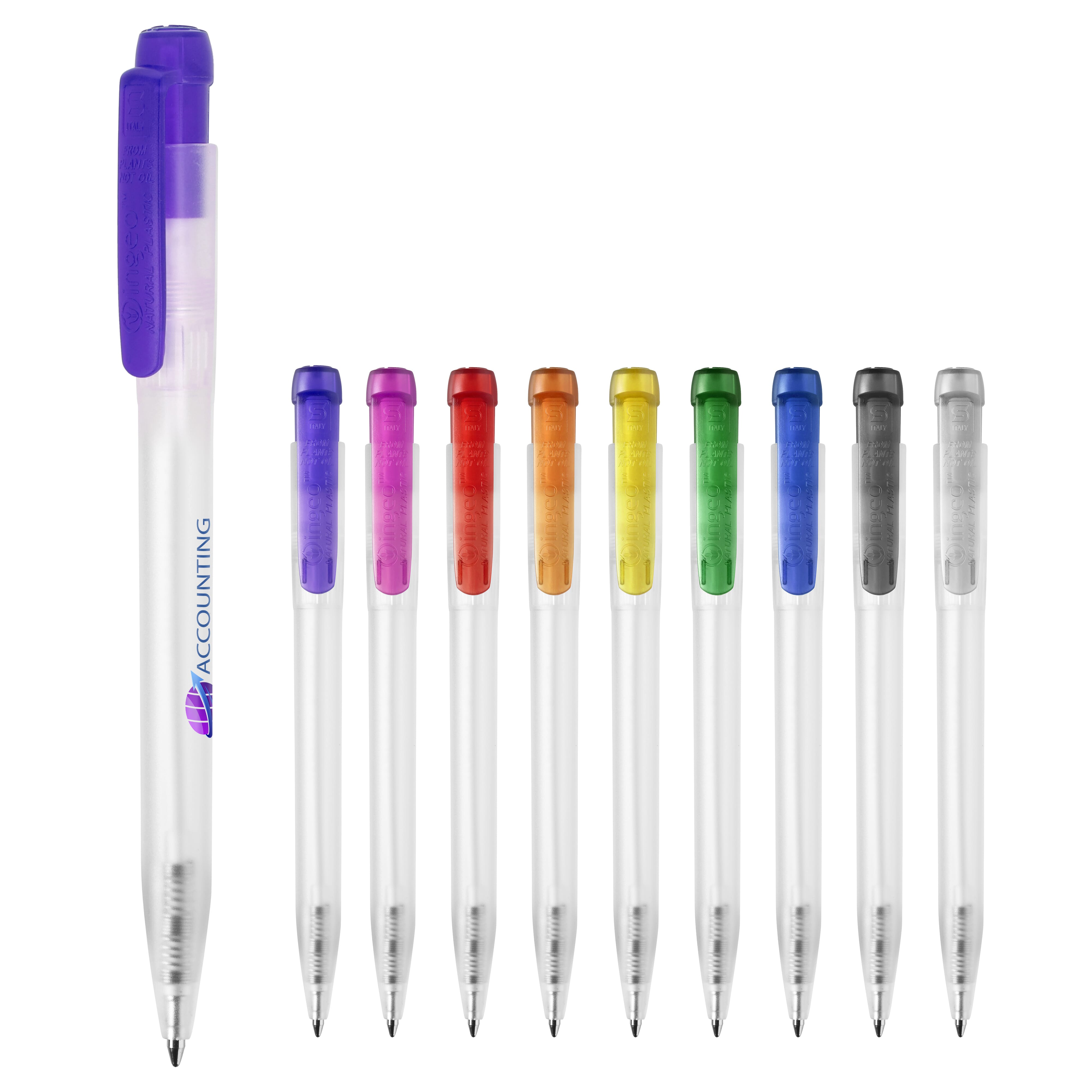 Frosty Ingeo TM Kugelschreiber mit transparentem farbigem Clip. Ab 5.500 Stück sind eigene Farbkombinationen möglich. Hergestellt aus PLA, einem biologisch abbaubarem Material. Dies bedeutet, dass es eine gute und umweltfreundliche Wahl als Werbeartikel ist. Ausgestattet mit einer blau schreibenden X20-Refill-Mine. Der Druckkugelschreiber besteht aus ABS und wird in Europa hergestellt. Ab einer Abnahmemenge von 5.000 Stück sind eigene Farbkombinationen möglich.