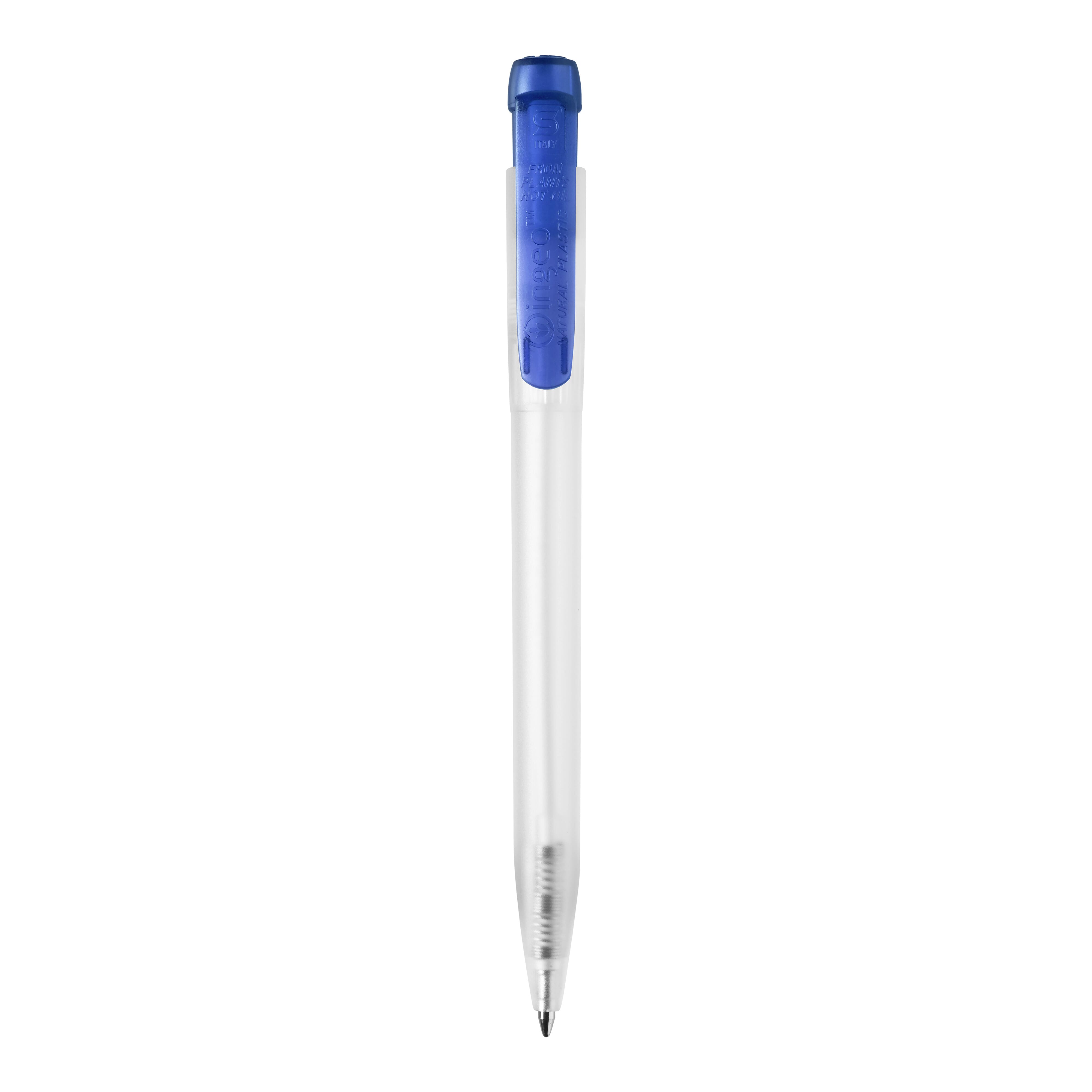 Frosty Ingeo TM Kugelschreiber mit transparentem farbigem Clip. Ab 5.500 Stück sind eigene Farbkombinationen möglich. Hergestellt aus PLA, einem biologisch abbaubarem Material. Dies bedeutet, dass es eine gute und umweltfreundliche Wahl als Werbeartikel ist. Ausgestattet mit einer blau schreibenden X20-Refill-Mine. Der Druckkugelschreiber besteht aus ABS und wird in Europa hergestellt. Ab einer Abnahmemenge von 5.000 Stück sind eigene Farbkombinationen möglich.
