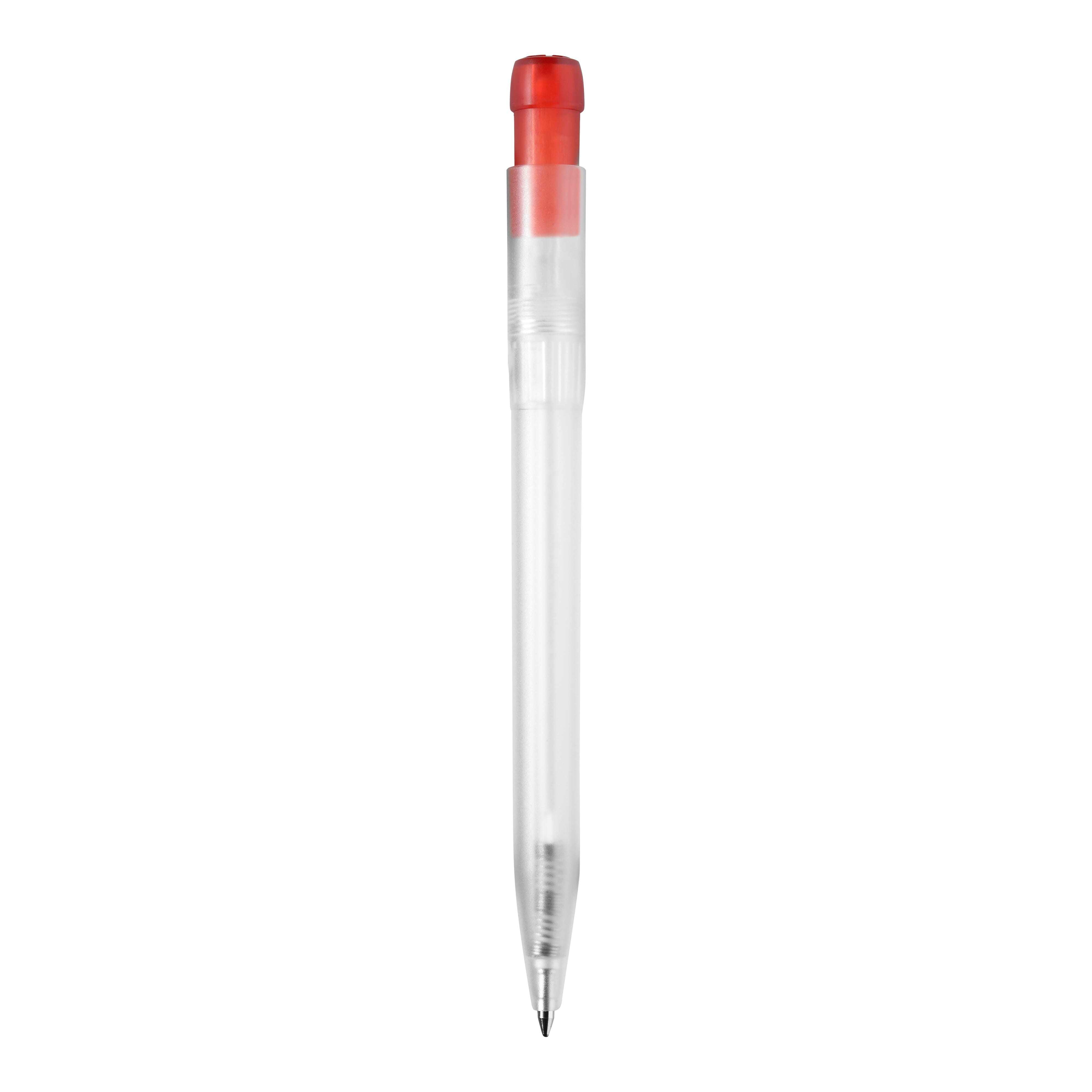 Frosty Ingeo TM Kugelschreiber mit transparentem farbigem Clip. Ab 5.500 Stück sind eigene Farbkombinationen möglich. Hergestellt aus PLA, einem biologisch abbaubarem Material. Dies bedeutet, dass es eine gute und umweltfreundliche Wahl als Werbeartikel ist. Ausgestattet mit einer blau schreibenden X20-Refill-Mine. Der Druckkugelschreiber besteht aus ABS und wird in Europa hergestellt. Ab einer Abnahmemenge von 5.000 Stück sind eigene Farbkombinationen möglich.