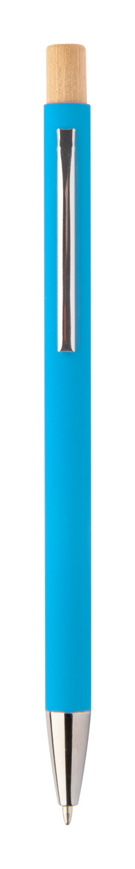 Kugelschreiber aus recyceltem Aluminium mit gummierter Oberfläche, Bambuskdrücker und verchromten Elementen. Mit Spezialbeschichtung für Spiegellasergravur, blauschreibend.