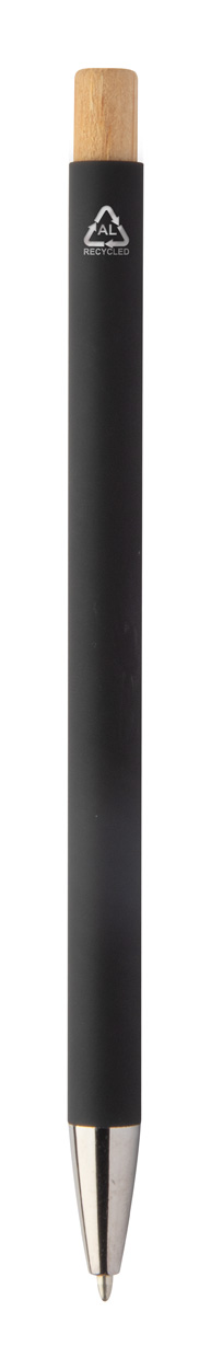 Kugelschreiber aus recyceltem Aluminium mit gummierter Oberfläche, Bambuskdrücker und verchromten Elementen. Mit Spezialbeschichtung für Spiegellasergravur, blauschreibend.
