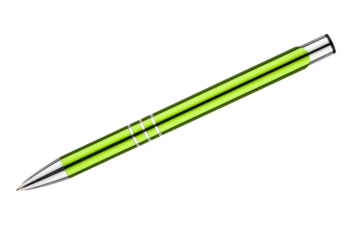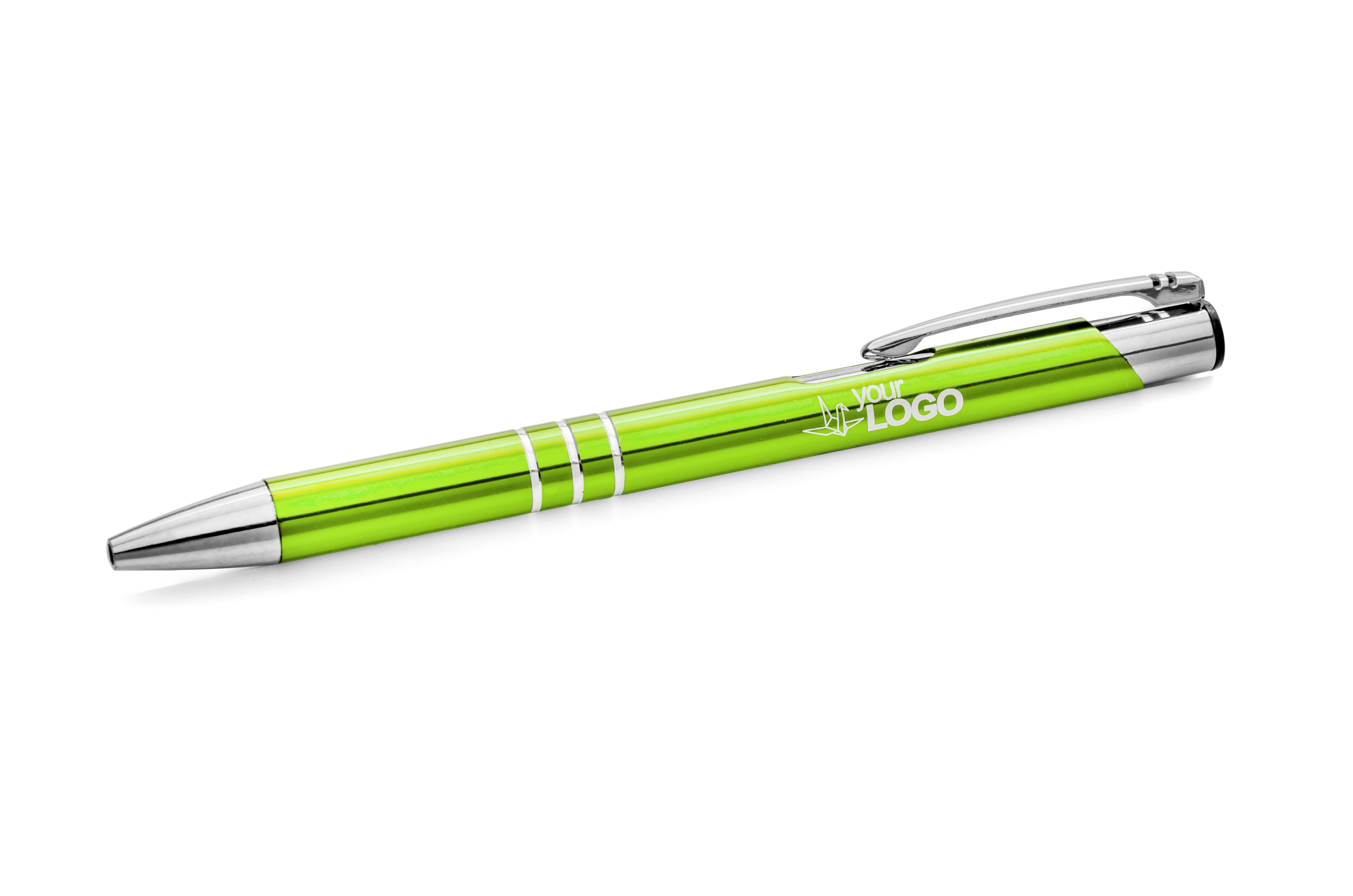 Kugelschreiber aus Metall mit verchromter Fläche. Schreibfarbe-blau. Verziert mit 3 Metallringen. Das Logo wird auf dem Kugelschreiber graviert.