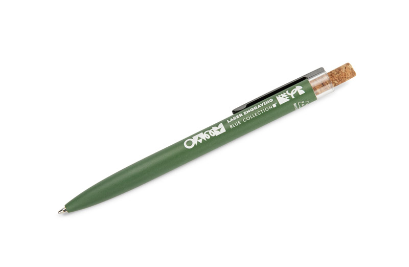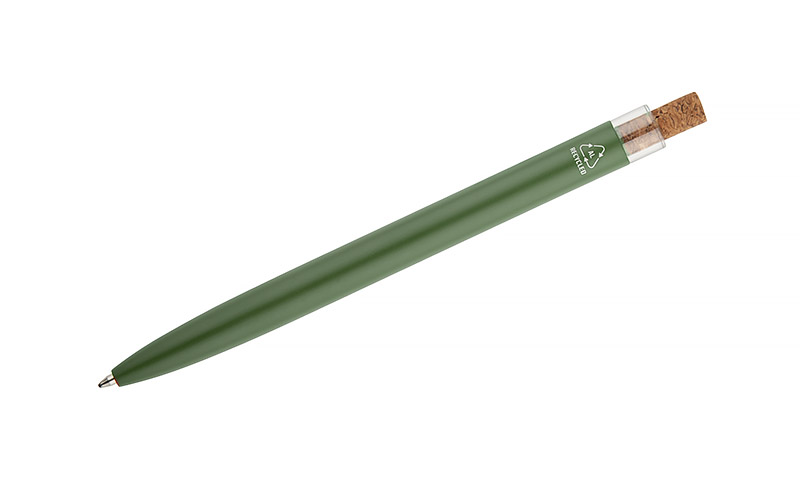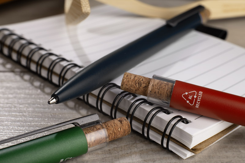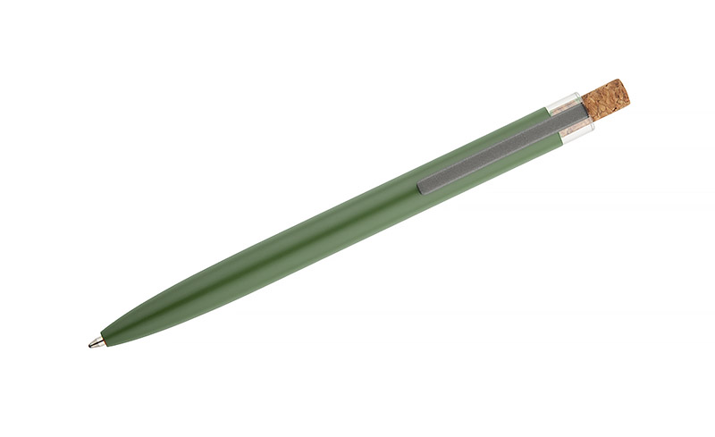 Der Kugelschreiber KORIN ist aus recyceltem Aluminium gefertigt und mit einer Lackierung versehen, die ihm eine glatte, satinierte Oberfläche verleiht. Er verfügt über eine automatische Mechanik, eine G2-Mine mit einer Schreibstärke von 1,0 mm und einen graphitfarbenen Metallclip. Der Korkknopf setzt einen interessanten Akzent und unterstreicht den modernen Charakter des Schreibgeräts. Der KORIN ist leicht, robust und komfortabel für den täglichen Gebrauch.