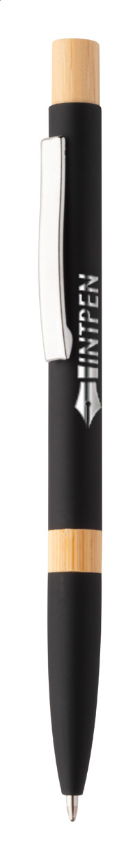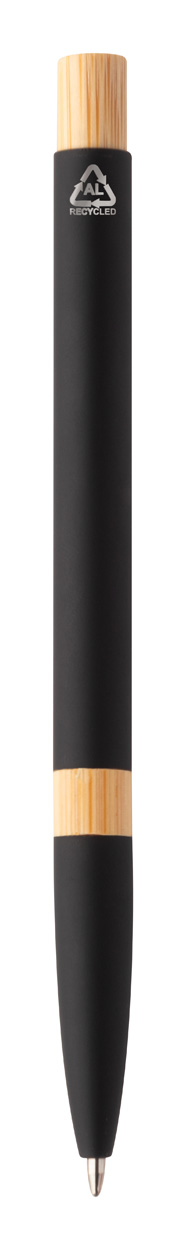 Kugelschreiber aus recyceltem Aluminium mit Bambus-Elementen, gummierter Oberfläche und verchromten Clip. Mit Spezialbeschichtung für Spiegelgravuren. Blauschreibend.