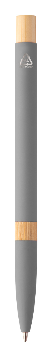 Kugelschreiber aus recyceltem Aluminium mit Bambus-Elementen, gummierter Oberfläche und verchromten Clip. Mit Spezialbeschichtung für Spiegelgravuren. Blauschreibend.