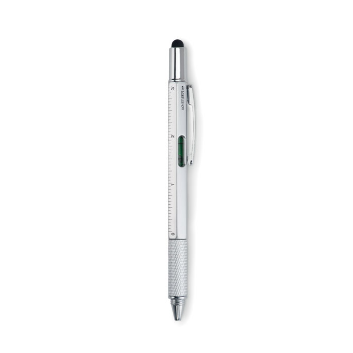Drehkugelschreiber mit Stylus, aufgedrucktem Lineal und Mini-Wasserwaage (Gimmick), sowie integriertem Kreuz- und Schlitzschraubenzieher. Schwarze Tinte.