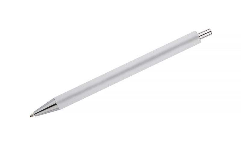Kugelschreiber NOVI hat eine gummierte Oberfläche und silberfarbene Chromelemente. Blaue Mine.