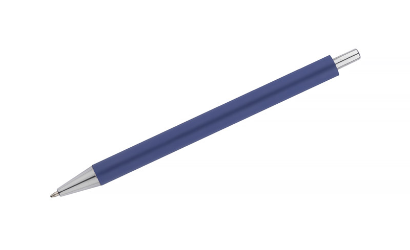 Kugelschreiber NOVI hat eine gummierte Oberfläche und silberfarbene Chromelemente. Blaue Mine.