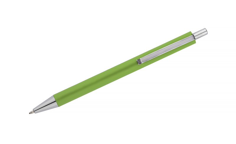 Kugelschreiber NOVI hat eine gummierte Oberfläche und silberfarbene Chromelemente. Blaue Mine.