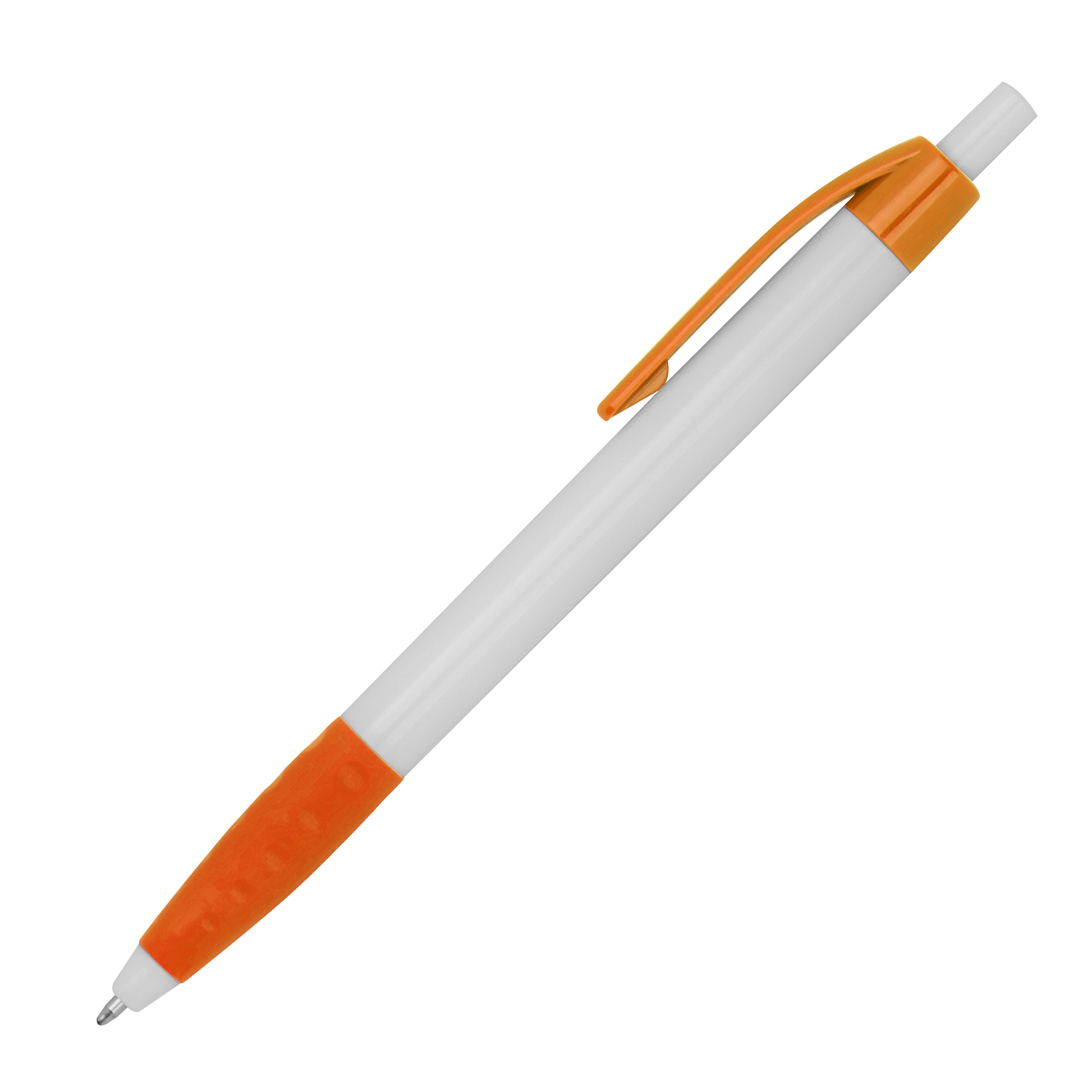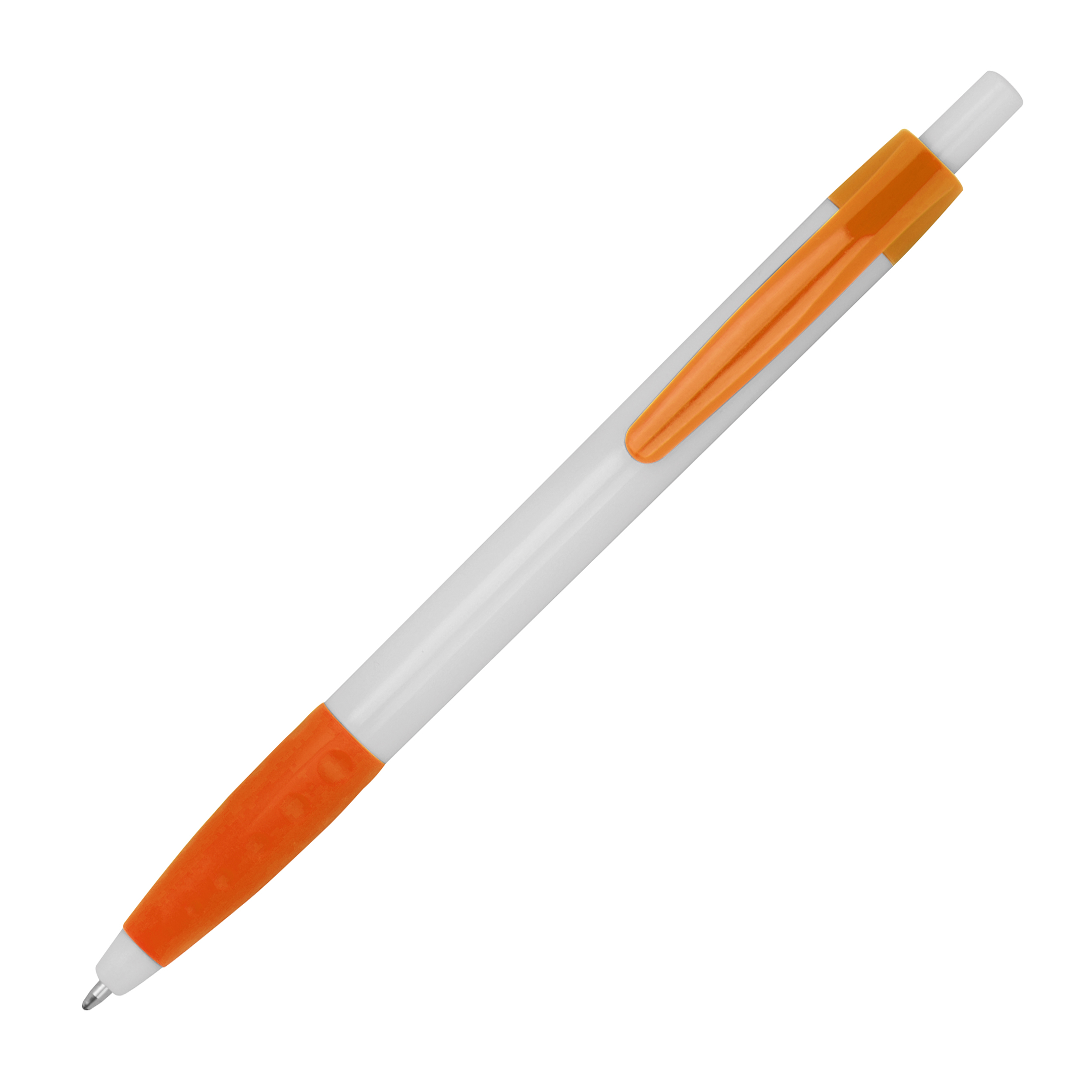 Kugelschreiber aus Kunststoff mit farbigen Akzenten und einer gummiertem Griffzone. Der Kugelschreiber verfügt über eine blauschreibende Kunststoffmine. Ihre Werbung drucken wir rechts vom Clip.