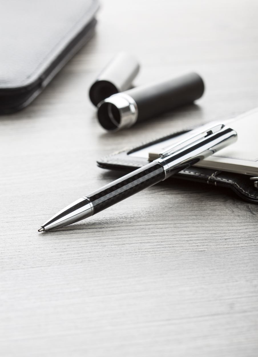 Metall-Kugelschreiber mit Carbon-Design, blauschreibend.