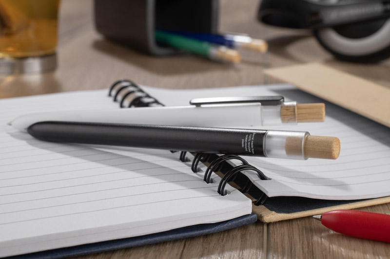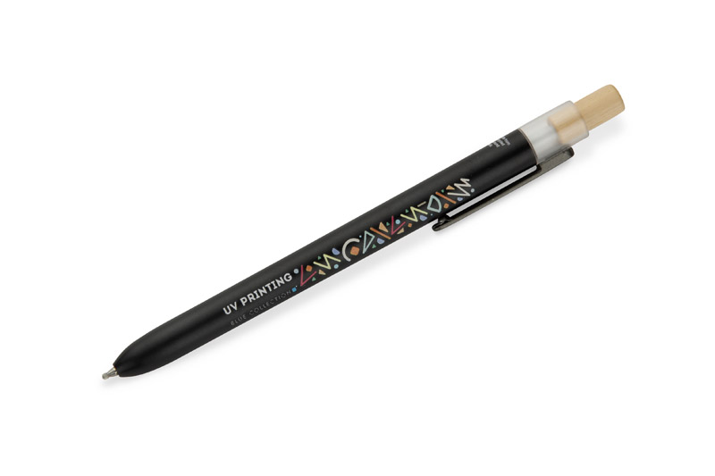 Der OCEANO-Kugelschreiber wird aus Material hergestellt, das aus ozeangebundenen Abfällen gewonnen wird - aus Kunststoffen, die in Küstengebieten gesammelt werden, bevor sie in den Meeren und Ozeanen landen. Er hat einen lackierten Schaft, einen Bambusknopf und einen Metallclip, was ihm ein modernes Aussehen und eine angenehme Oberfläche verleiht. Der automatische Mechanismus erleichtert den täglichen Gebrauch, und die G2-Mine mit 0,5 mm starker Geltinte sorgt für ein flüssiges und präzises Schreiben.