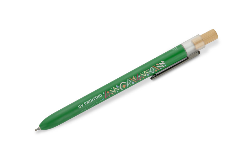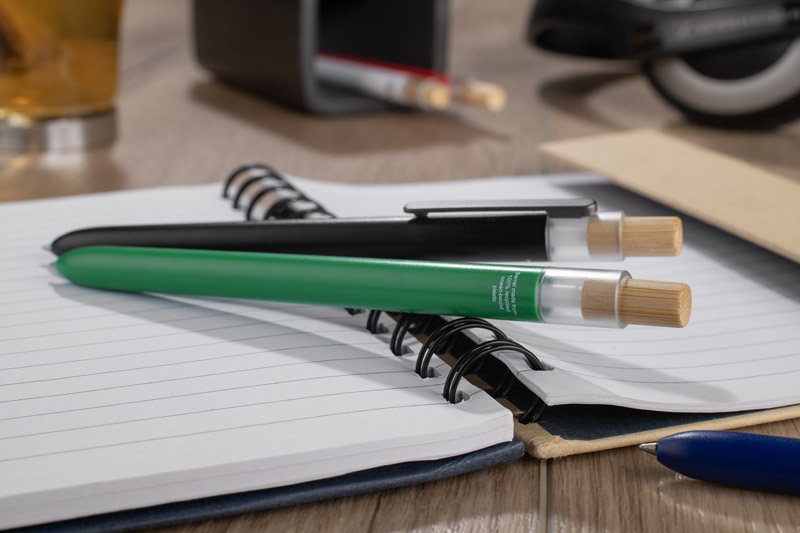 Der OCEANO-Kugelschreiber wird aus Material hergestellt, das aus ozeangebundenen Abfällen gewonnen wird - aus Kunststoffen, die in Küstengebieten gesammelt werden, bevor sie in den Meeren und Ozeanen landen. Er hat einen lackierten Schaft, einen Bambusknopf und einen Metallclip, was ihm ein modernes Aussehen und eine angenehme Oberfläche verleiht. Der automatische Mechanismus erleichtert den täglichen Gebrauch, und die G2-Mine mit 0,5 mm starker Geltinte sorgt für ein flüssiges und präzises Schreiben.