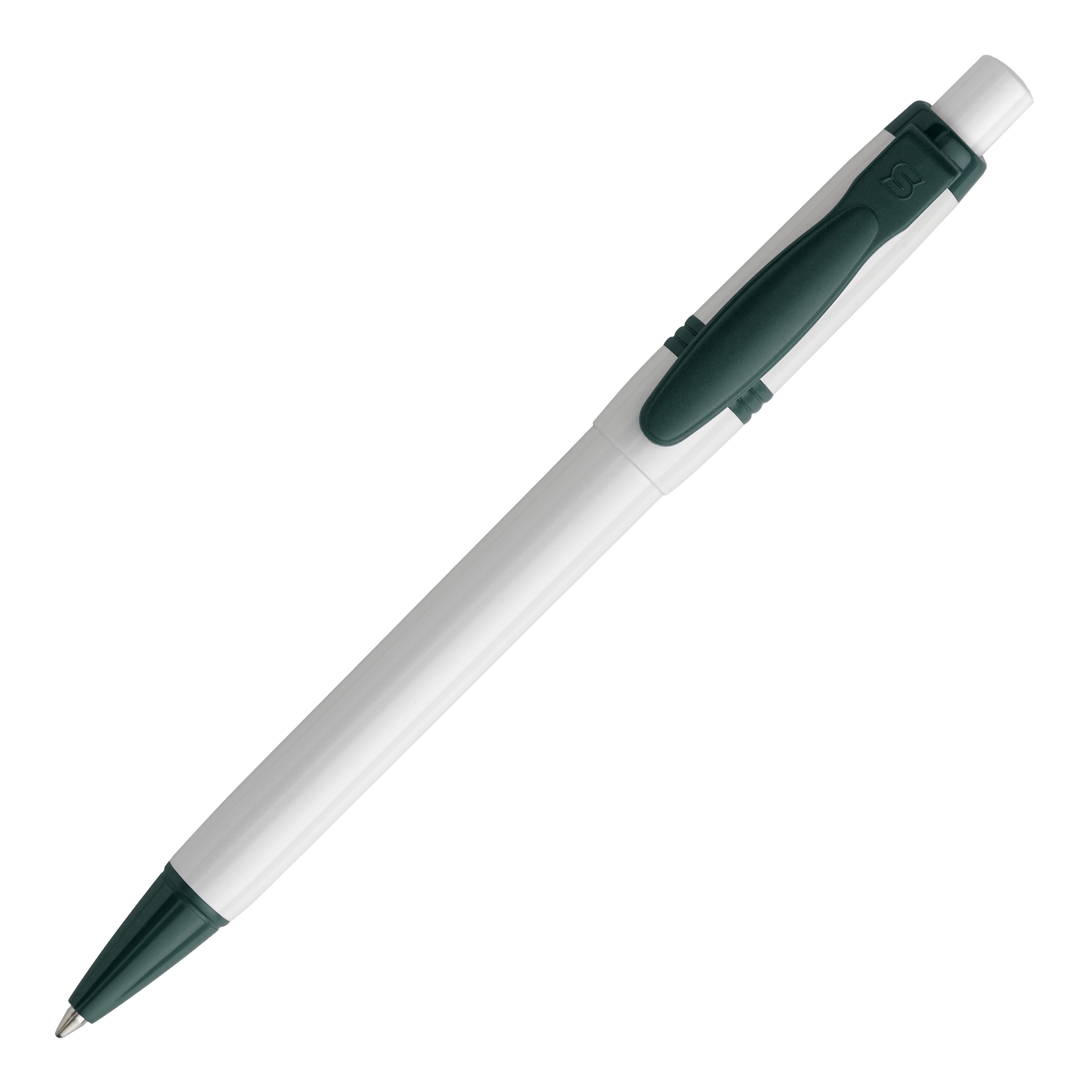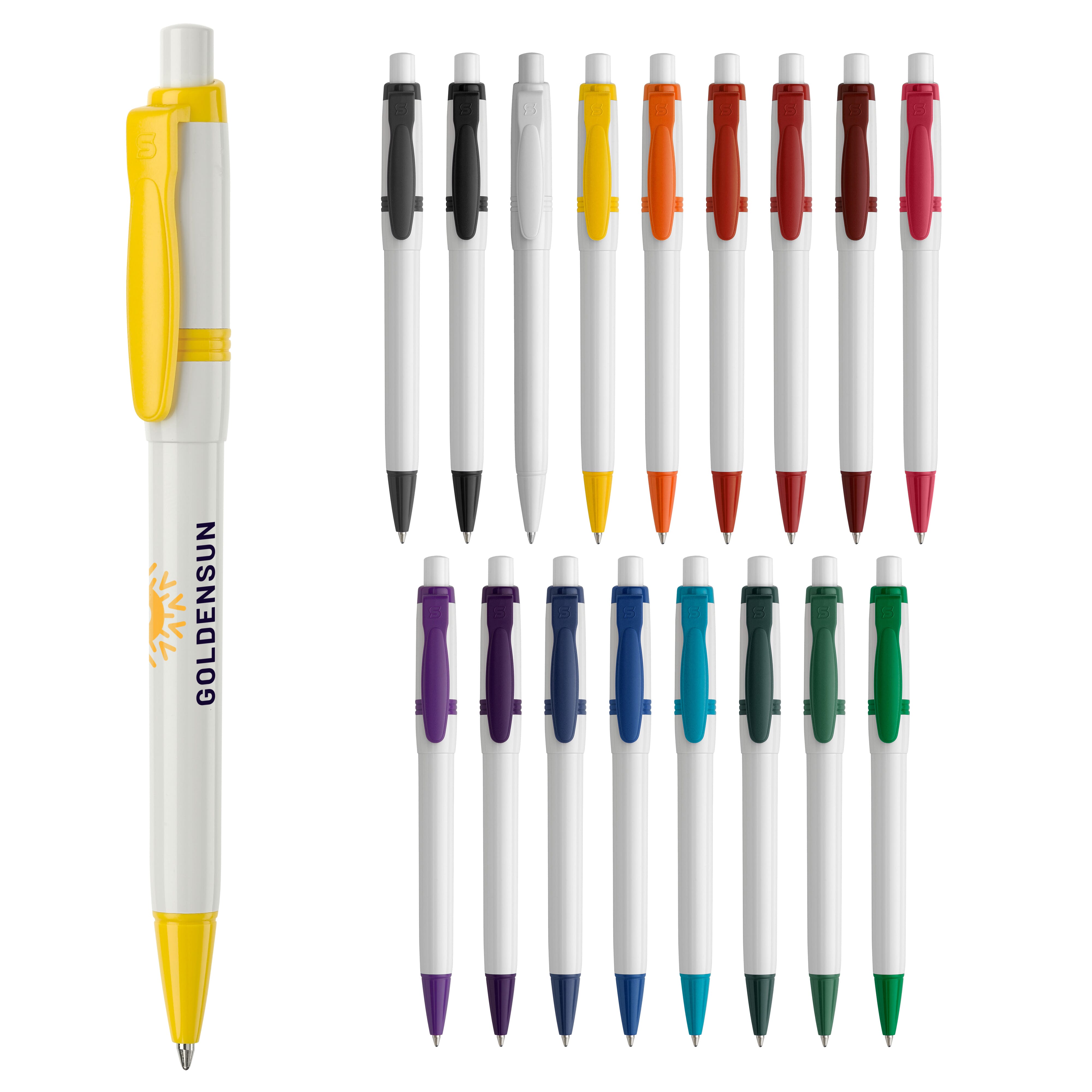 Der Hardcolour Kugelschreiber Olly mit weißem Schaft und farbigem Clip. Ausgestattet mit einer blau schreibenden Jumbo-Mine. Der Druckkugelschreiber besteht aus ABS und wird in Europa hergestellt. Ab einer Abnahmemenge von 5.000 Stück sind eigene Farbkombinationen möglich.