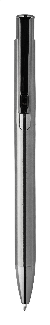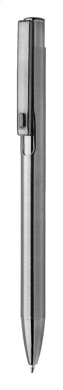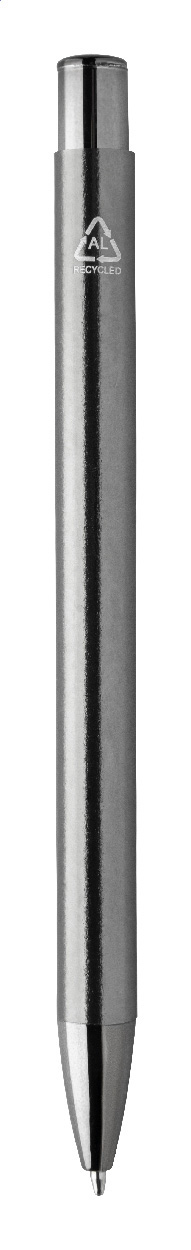 Kugelschreiber aus recyceltem Aluminium mit glänzendem Metallic-Finish, blauschreibend.