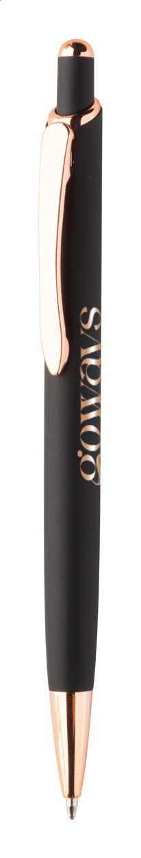 Kugelschreiber aus recyceltem Aluminium mit gummierter Oberfläche und rosagoldenen Elemnten Mit Spezialbeschichtung für rosagoldfarbene Spiegelgravuren. Blauschreibend.