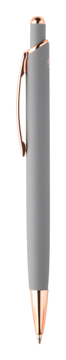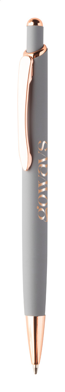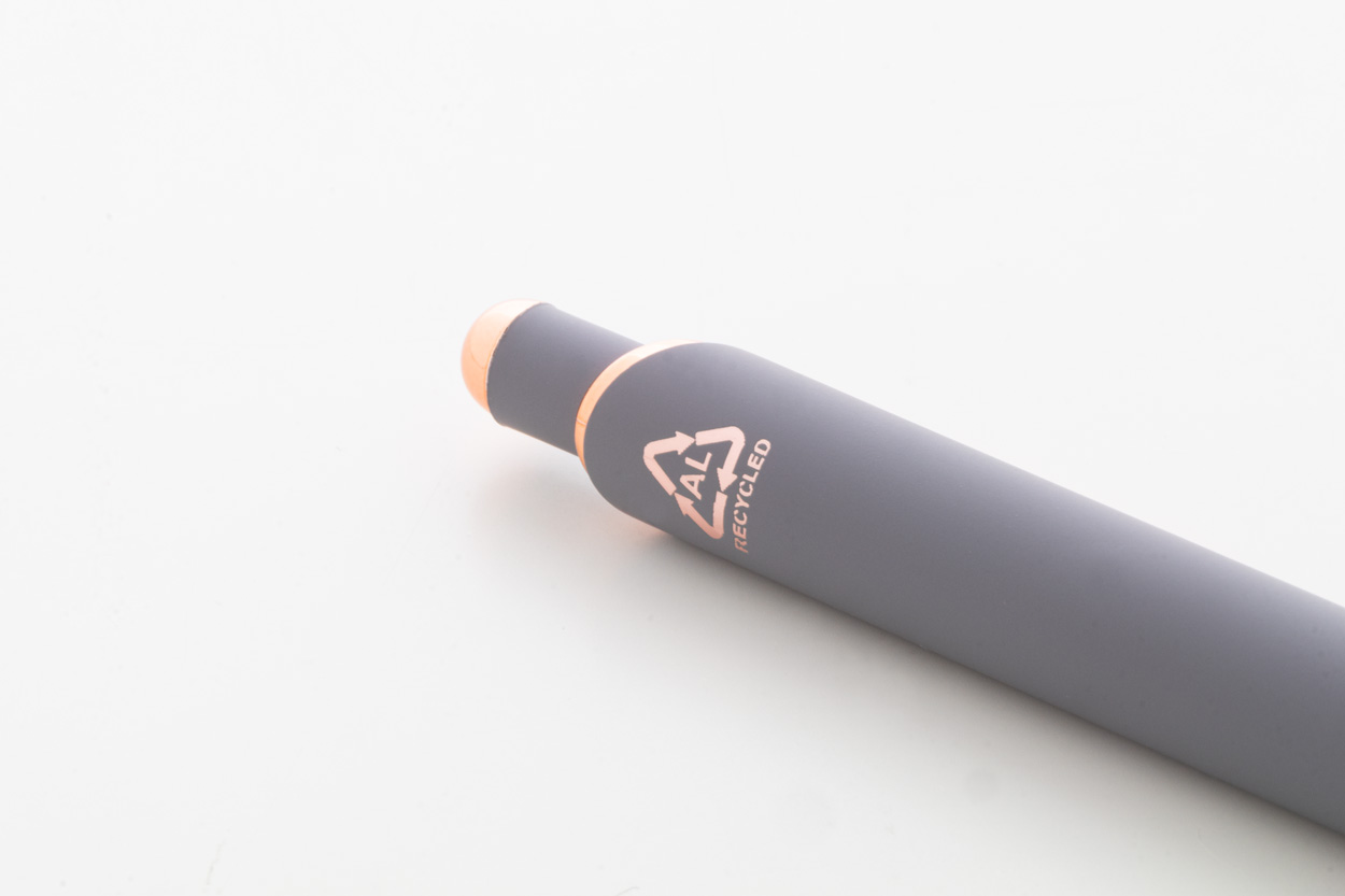 Kugelschreiber aus recyceltem Aluminium mit gummierter Oberfläche und rosagoldenen Elemnten Mit Spezialbeschichtung für rosagoldfarbene Spiegelgravuren. Blauschreibend.
